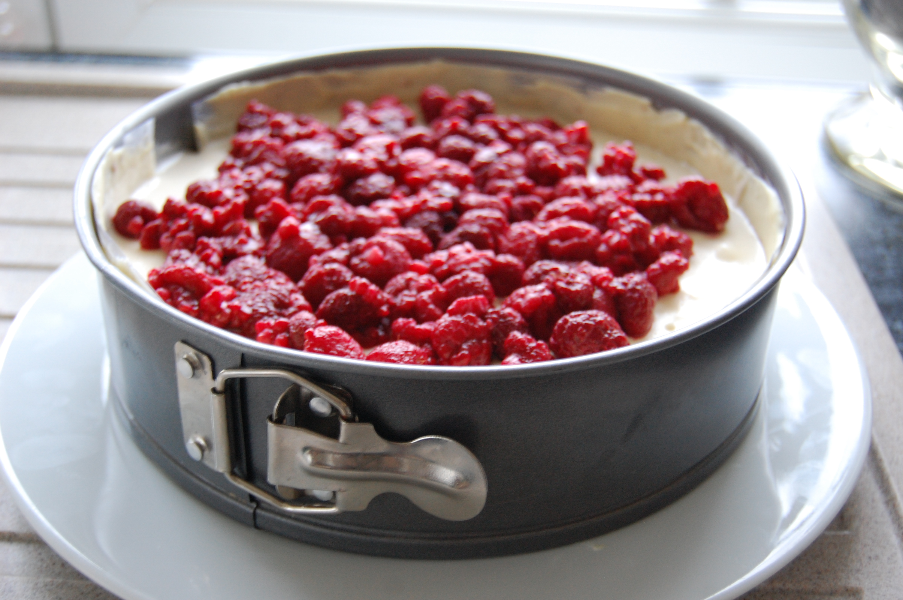 Préparez le montage : Placer la génoise dans un cercle, entourée par la bande de rhodoïd. Versez la mousse vanille-coco. Disposez les framboises et remettre au frais pendant minimum 4 heures. (Je conseille vivement de laisser prendre toute une nuit et de servir le lendemain).