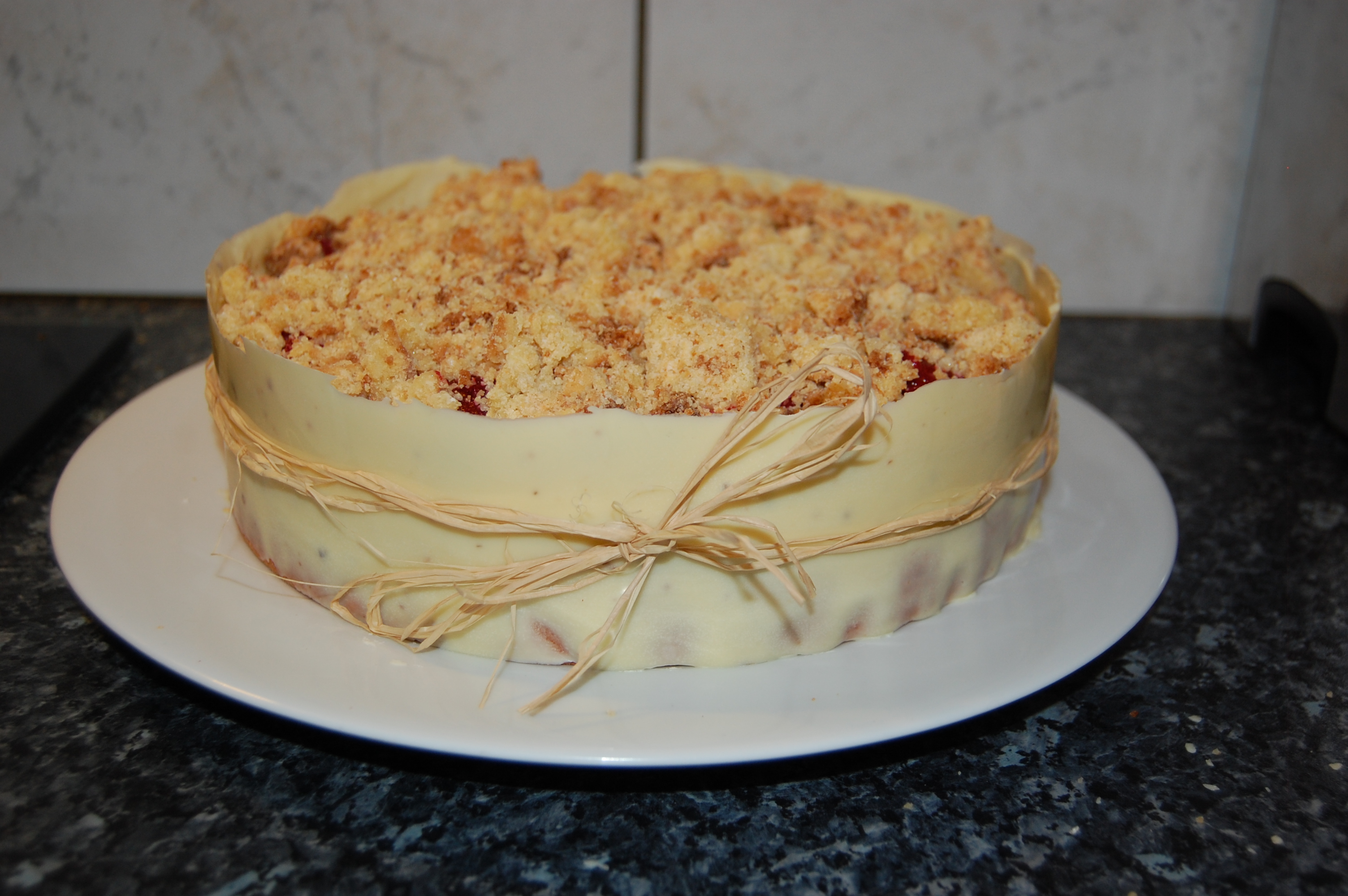 Pour le cercle de chocolat blanc : Faites fondre le chocolat blanc. Attendre qu’il soit légèrement refroidit et assez dur. Coupez une bande de rhodoïd de la circonférence du gâteau. Etalez le chocolat blanc sur toute la largeur du cercle. Attendre 5 minutes.