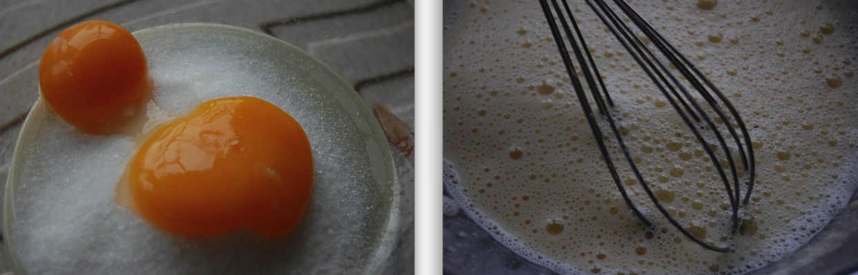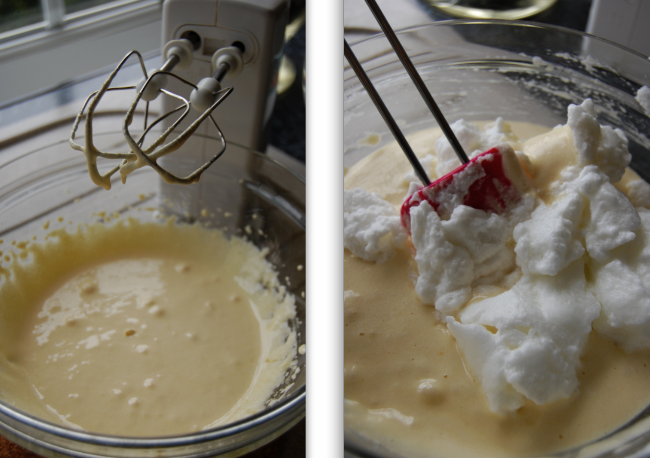 Séparez les jaunes des blancs d’oeufs. Fouettez les jaunes avec le sucre jusqu’à ce que le mélange double de volume et blanchisse. Ajoutez la farine puis le lait. Montez les blancs en neige ferme puis incorporez à la préparation.