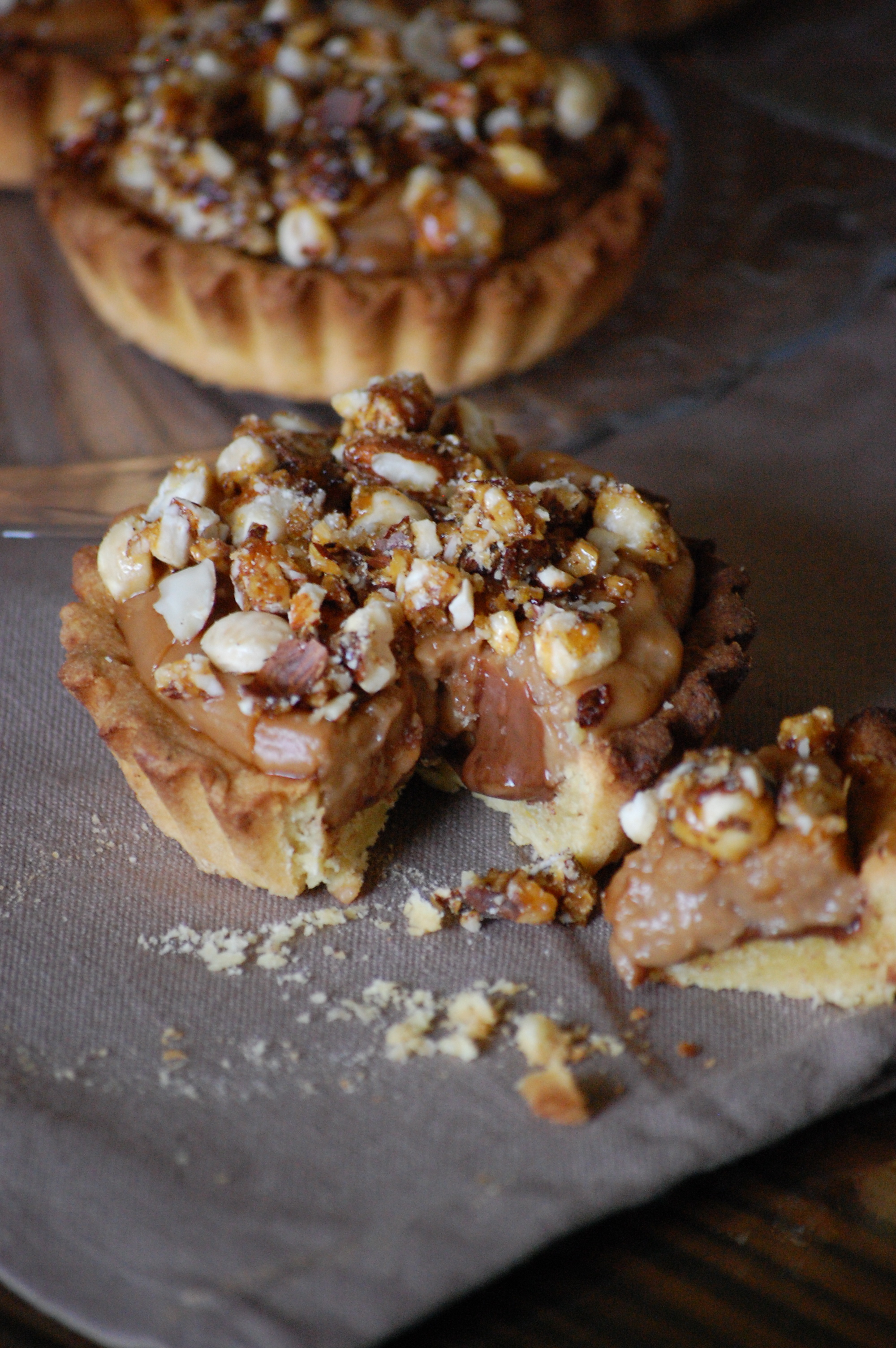DSC_0404Parce que le temps n’est toujours pas digne du printemps et que c’est fêtes en ce moment, mon envie de chocolat et de praliné est un peu trop constante. Du coup, j’ai décidé de faire des petites tartelettes avec toutes mes envies du moment. Ca donne donc des petites tartelettes avec une fine couche de Nutella, une crème pâtissière praliné et des noisettes et amandes caramélisées sur une pâte sablée. Le must ? La pâte sablée ne repose qu’une heure pendant laquelle on peut finir toutes les autres préparations : le dessert est donc très rapide et ne nécessite pas d’interminables temps d’attente !