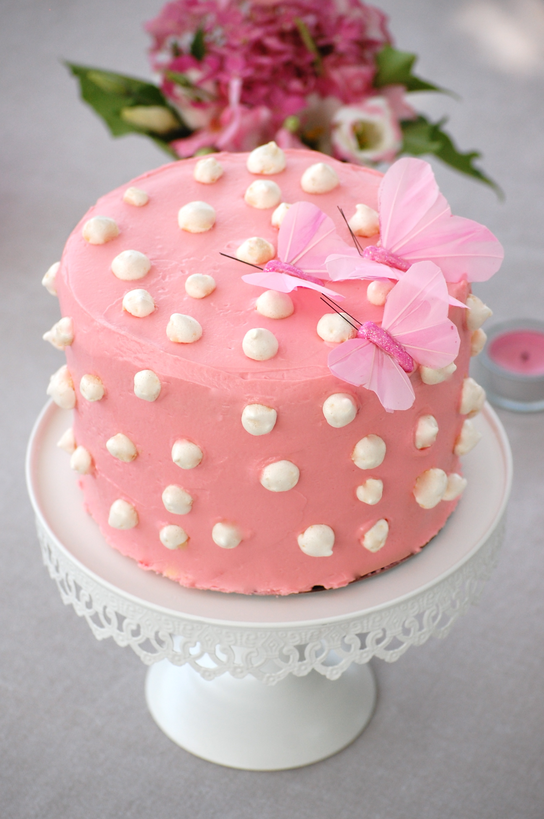 J’ai donc décidé de faire mon propre gâteau d’anniversaire (on est jamais mieux servi que par soi même non ?). J’ai préparé deux génoises bien vanillées et fait un insert aux saveurs estivales ; des framboises, de la mascarpone et du citron vert. Le tout recouvert d’un glaçage rose au cream cheese et de petites meringues pour décorer…