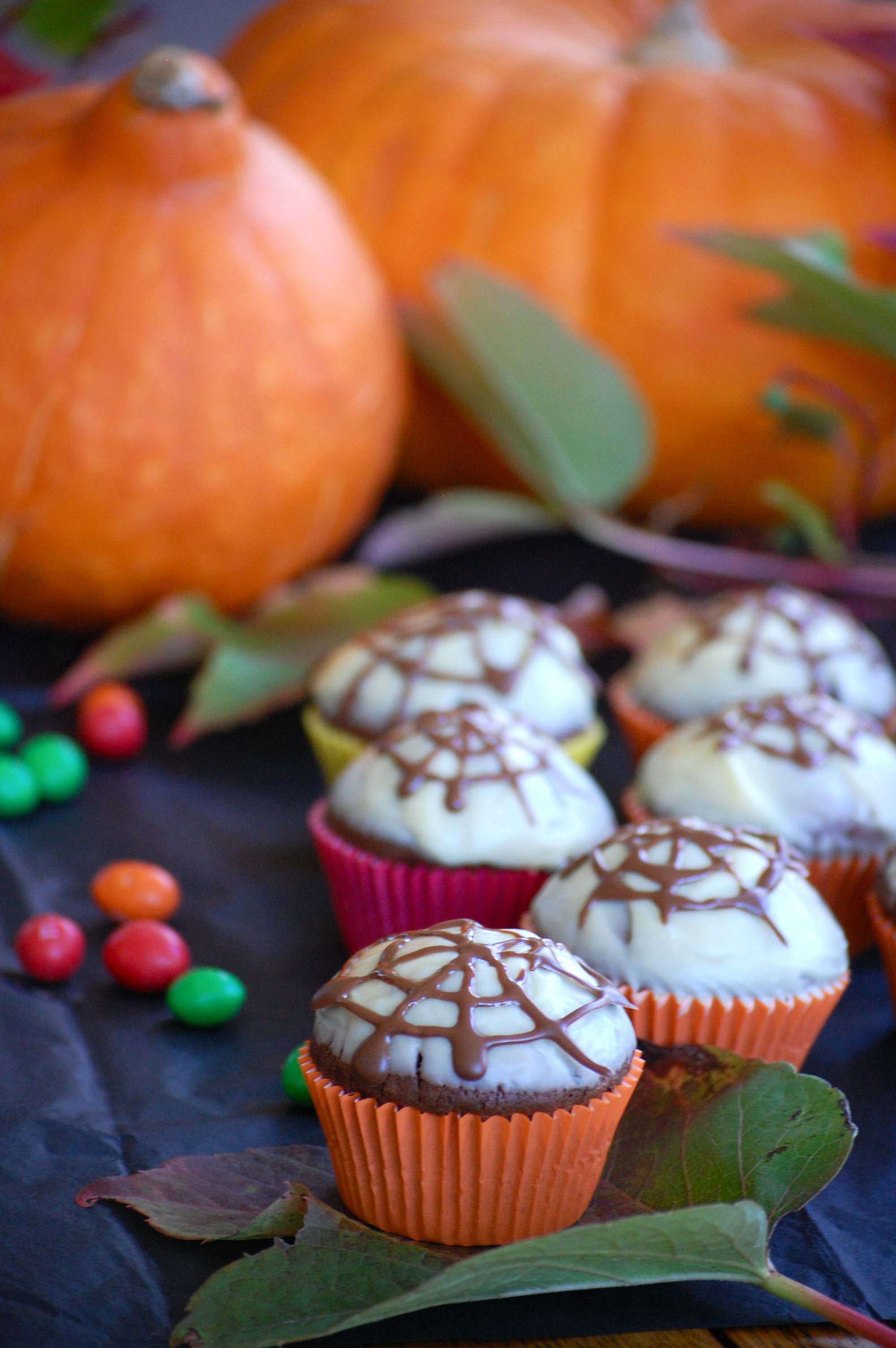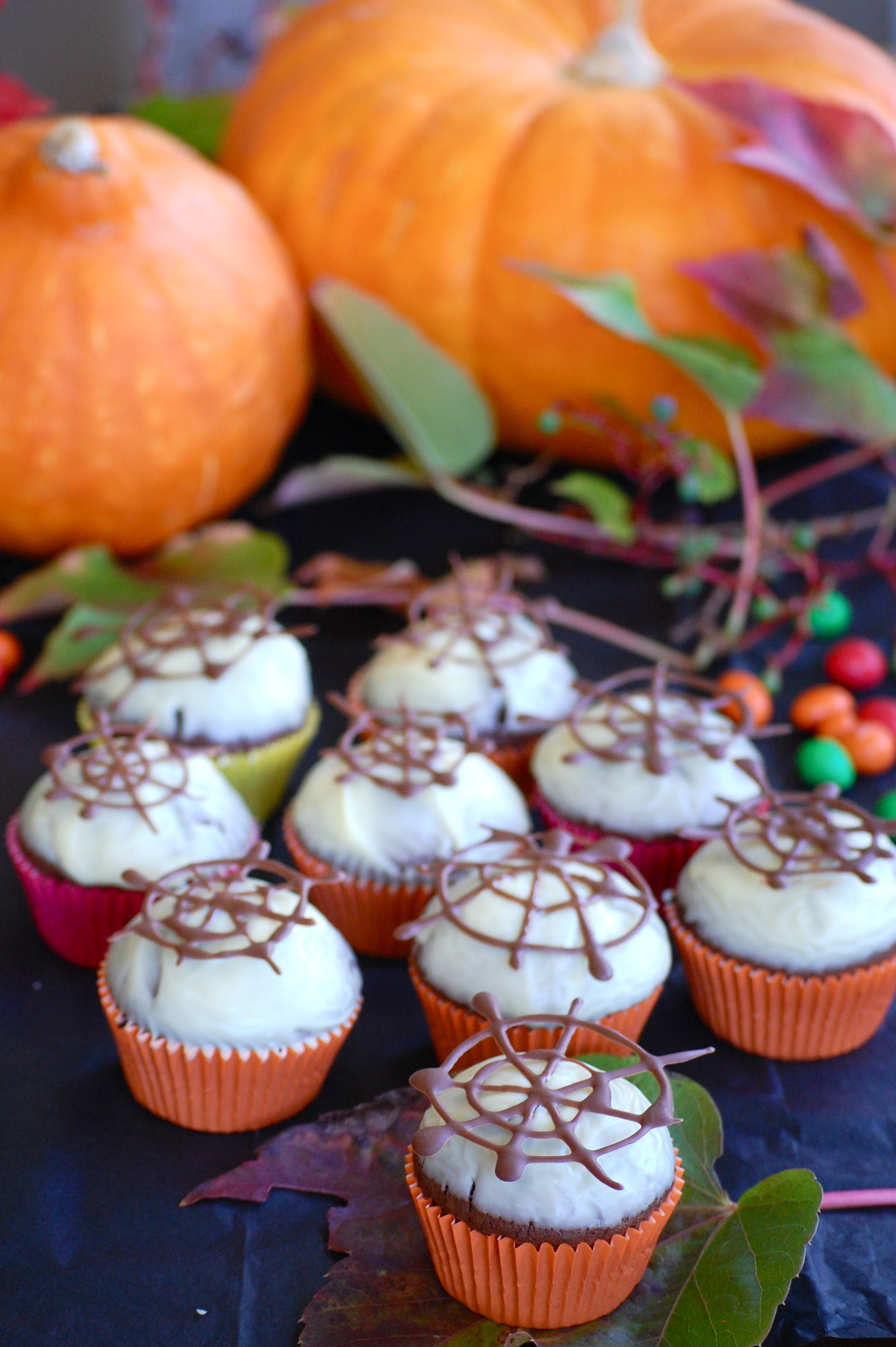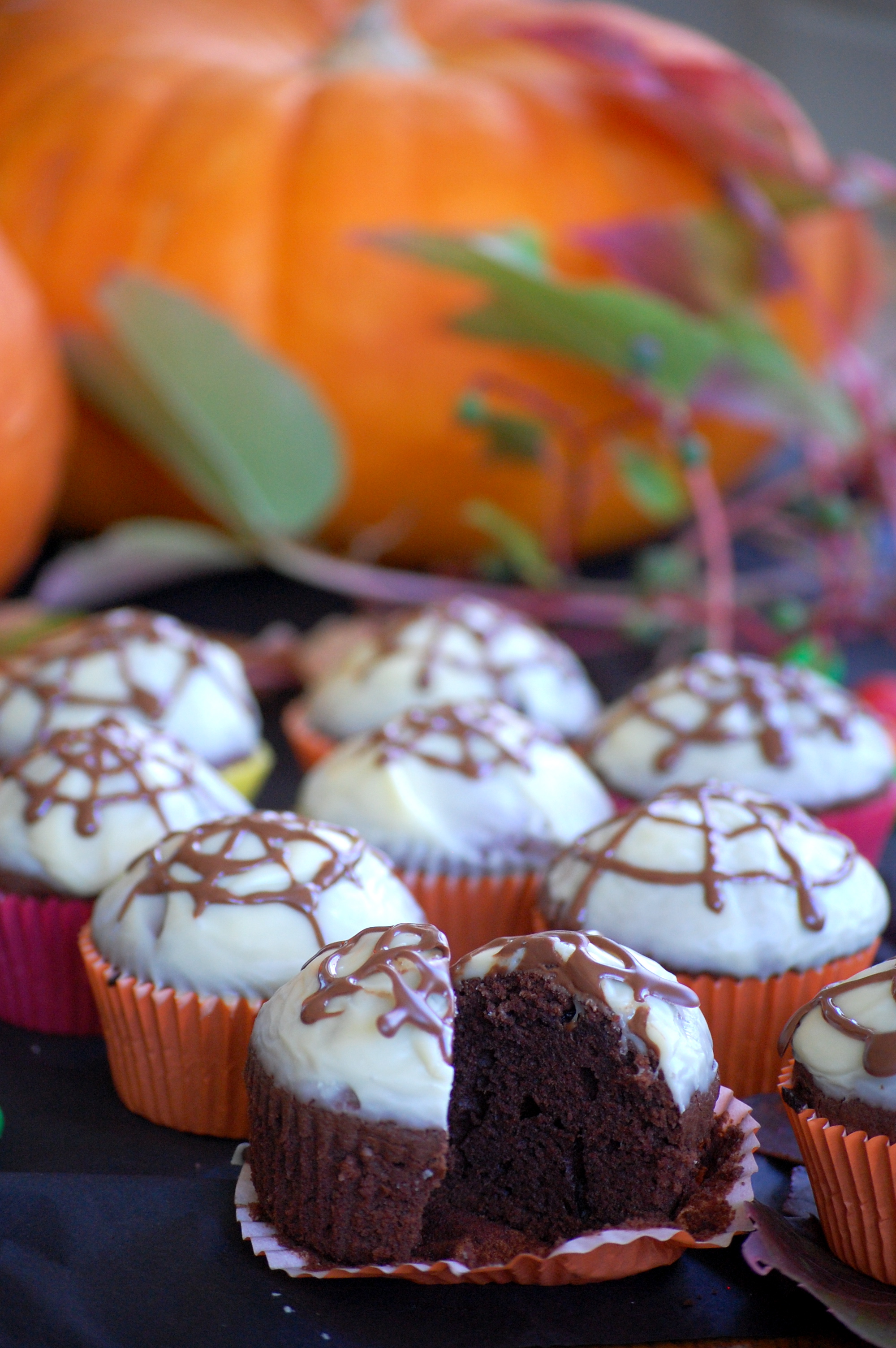 Pour Halloween aux Etats Unis les pâtisseries confectionnées à cette occasion sont souvent riches en sucreries (référence au fameux « trick-or-treat »). A la maison, on ne raffole pas vraiment du tout de sucreries, c’est pourquoi j’ai voulu rester sur une pâtisserie bonne et gourmande mais toujours avec l’esprit d’Halloween. C’est pourquoi j’ai décidé de faire des petits muffins au chocolat, avec une ganache au chocolat blanc en guise de glaçage et des petites toiles d’araignées en chocolat.