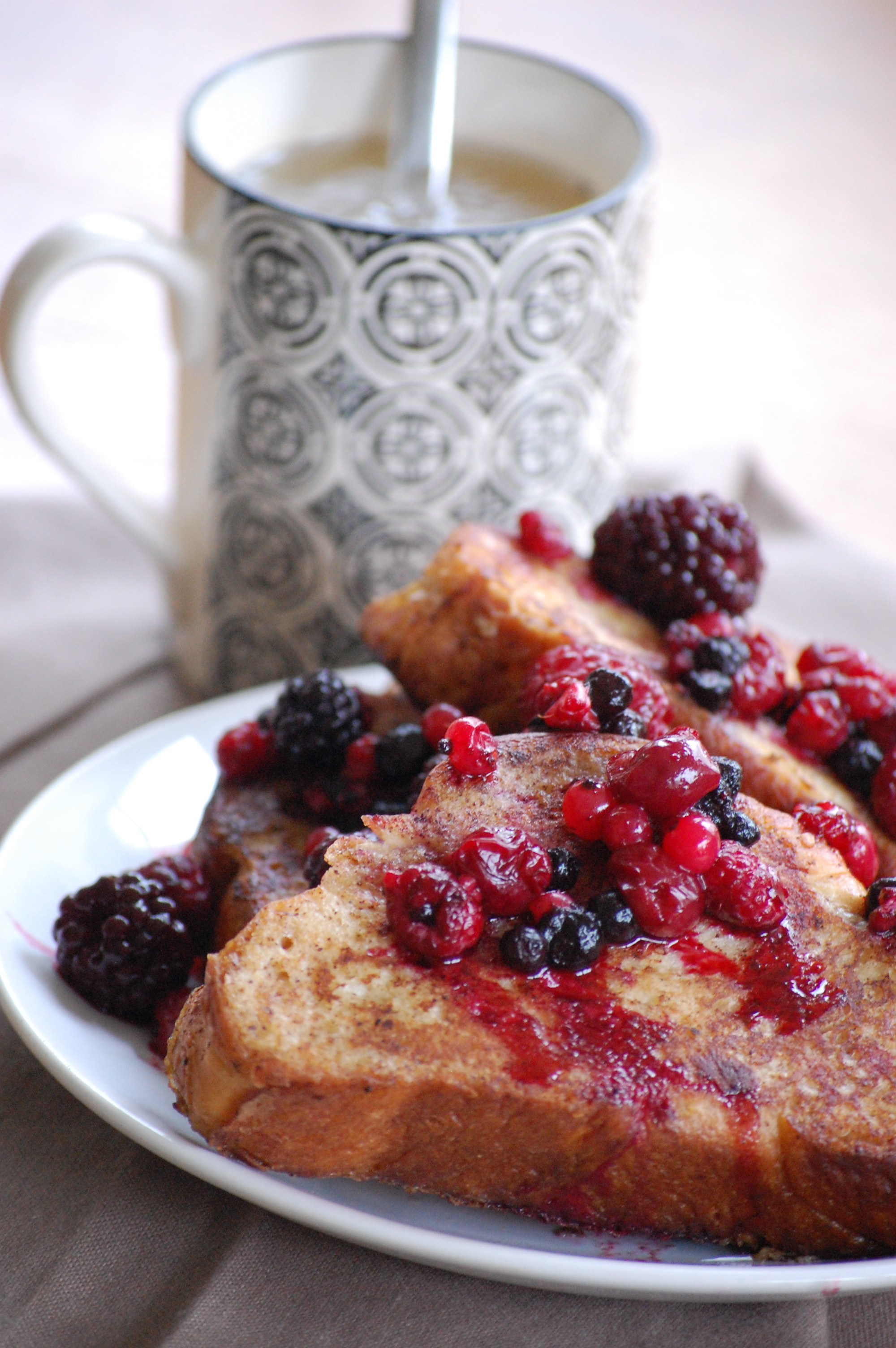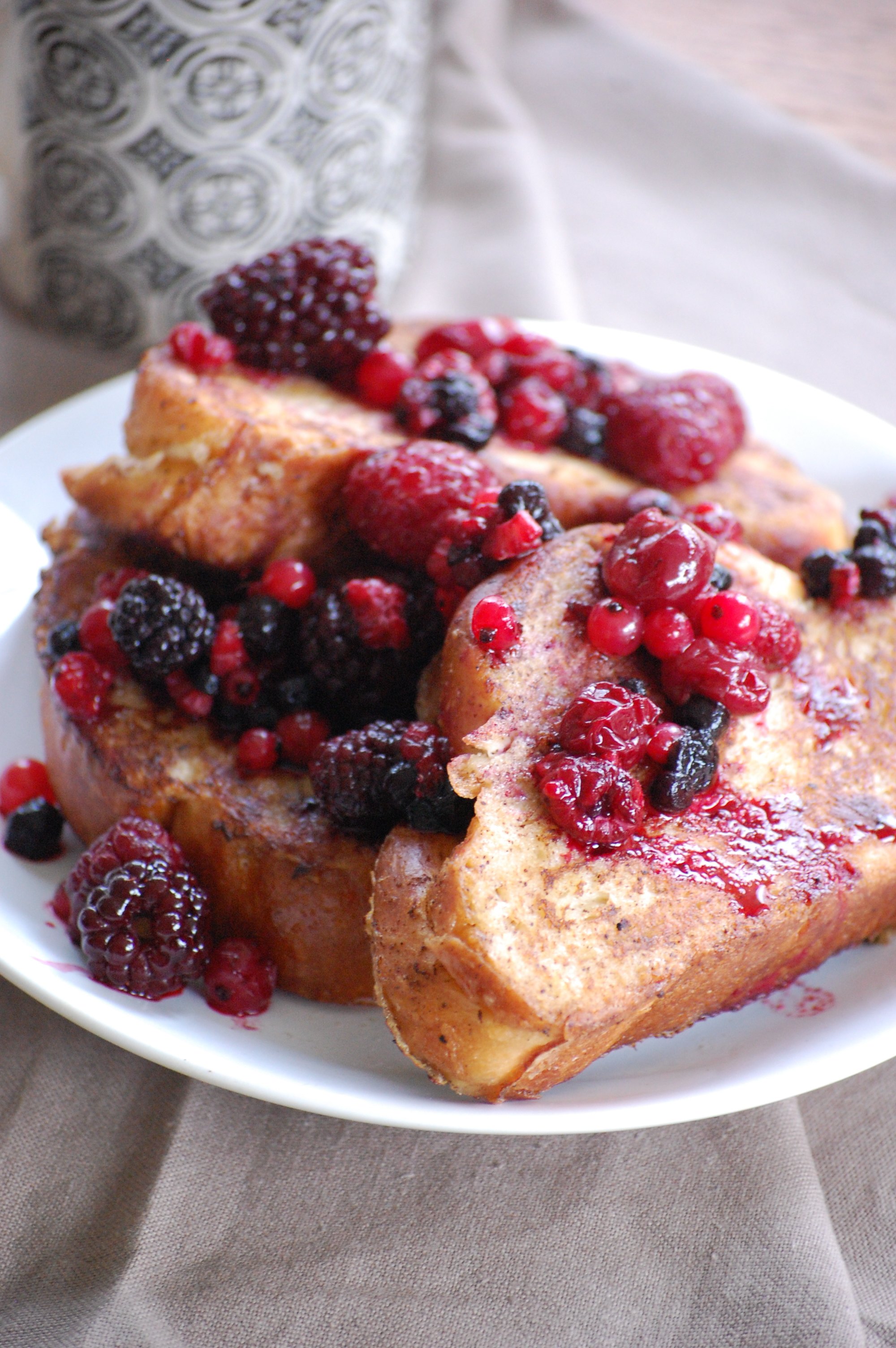 Challah makes the world’s best french toast! Your fruit topping and cinnamon makes this breakfast a treat! Your lighting on the berries makes them glisten. 🙂 Delicious, Sarah!