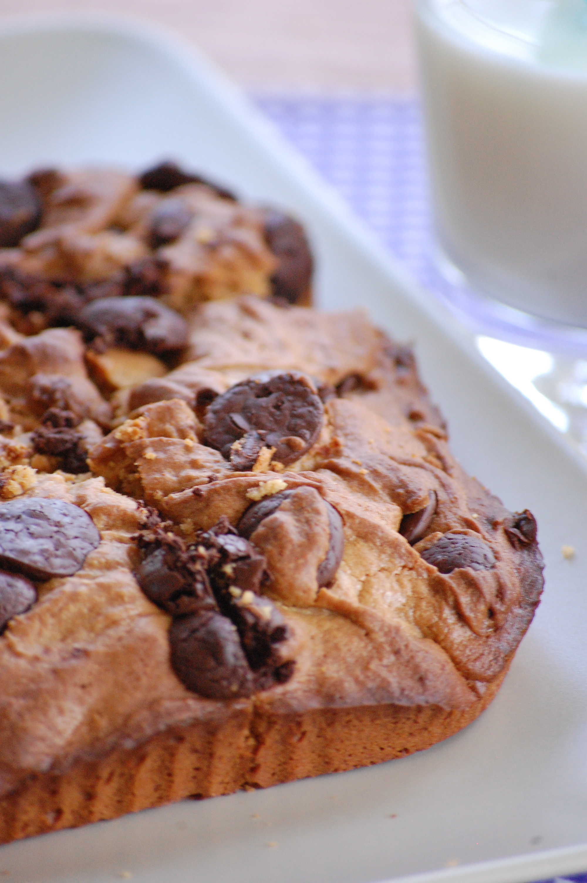 Versez dans un moule à brownies et parsemez le dessus avec le reste des pépites de chocolat. Enfournez pour 20min : surveillez la cuisson, il ne faut pas que le blondie soit trop cuit sinon il sera sec !