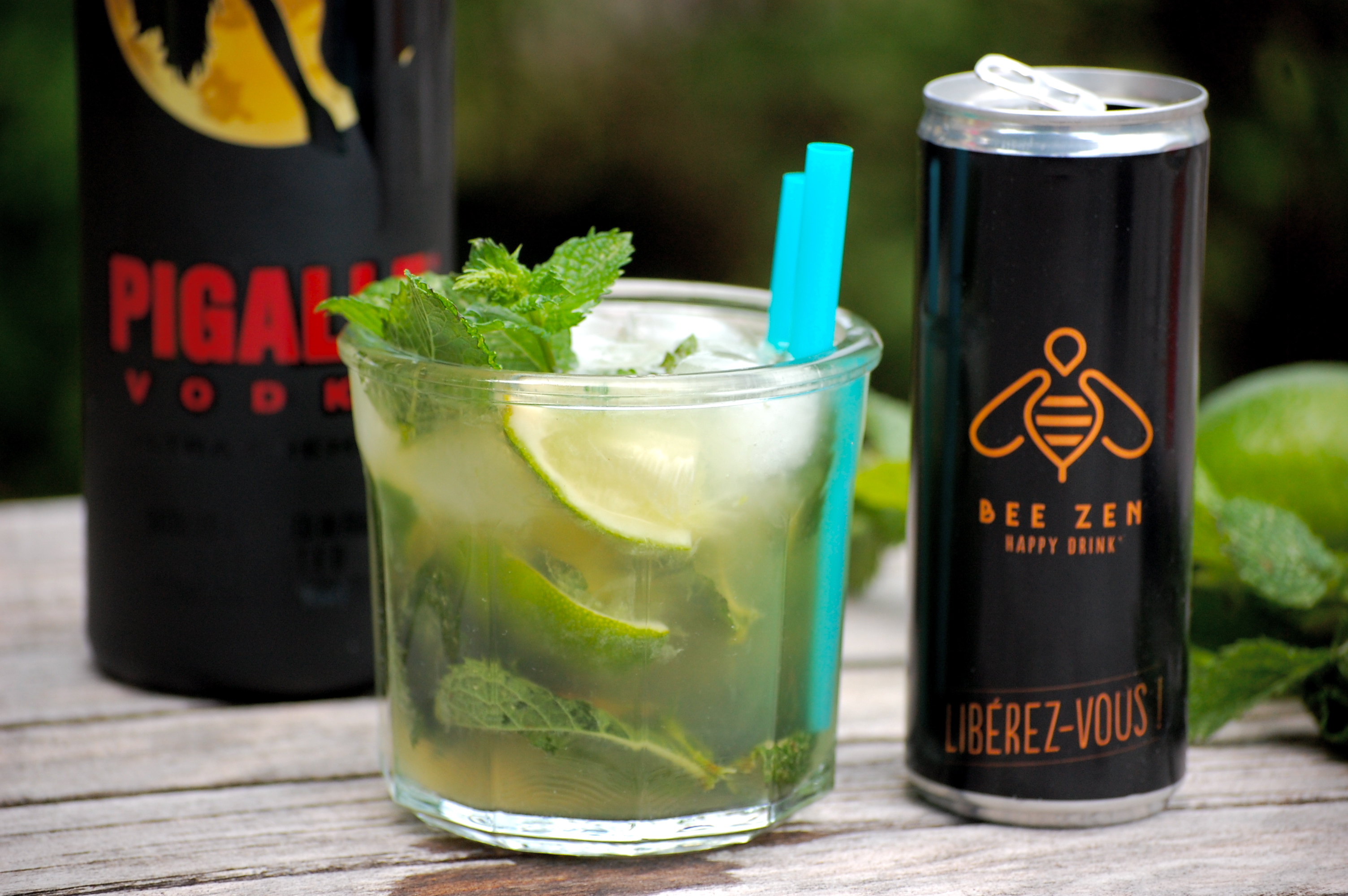 Dans un grand verre (j’ai utilisé un pot à confiture) : écrasez au pilon les morceaux de citron vert avec le sirop de sucre de canne. Une fois bien écrasé, ajoutez les feuilles de menthe (j’en ai mis une poignée à peu près) et pilonner encore. Ajoutez en suite la vodka et mélangez à la cuillère. Mettez les glaçons puis complétez le cocktail avec du BeeZen.