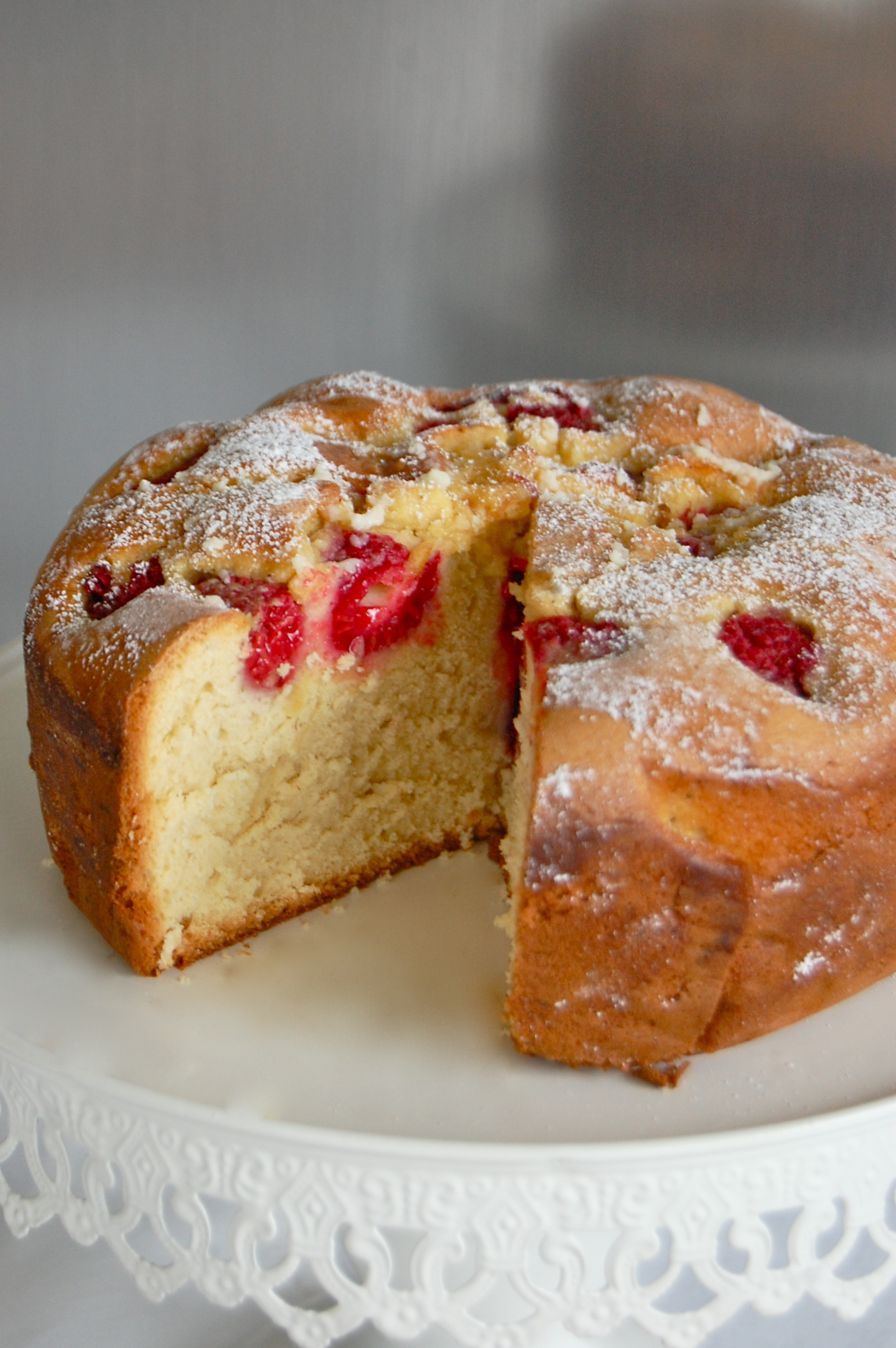 En faisant les courses l’autre jour je suis tombée sur des framboises. Plus vraiment la saison certes, mais je n’y résiste jamais ! Du coup, j’ai commencé à chercher une recette et c’est celle du blog de Une Plume Dans La Cuisine qui a attiré mon attention (très chouette blog d’ailleurs !). Son gâteau, ultra facile, a été testé un bon nombre de fois, et du coup, j’étais obligée de m’y atteler aussi. J’ai un peu changé les proportions, mais le gâteau est tout aussi bon !