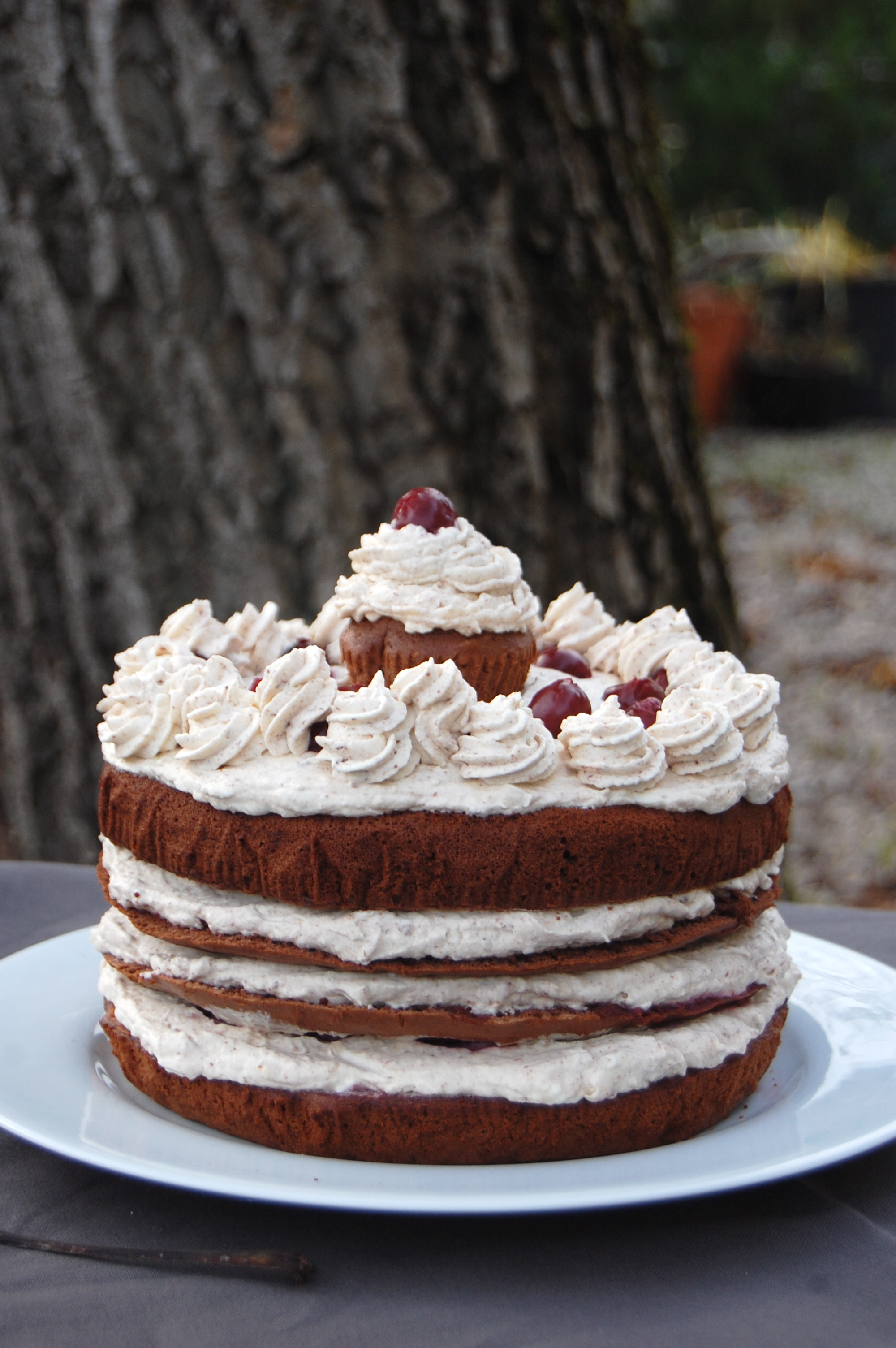 Du coup, je suis partie sur une forêt noire que je voulais un peu rustique et imparfaite. Et on a tous adoré, vraiment ! En même temps, peu de chance de se tromper avec une association chocolat+chantilly+cerise. Je n’ai pas mis d’alcool dedans mais vous pouvez mettre du kirch dans le sirop. Pour renforcer le goût de cerise, j’ai ajouté un peu de sirop de cerise au sirop contenu dans le bocal. J’ai aussi fait une chantilly stracciatella.