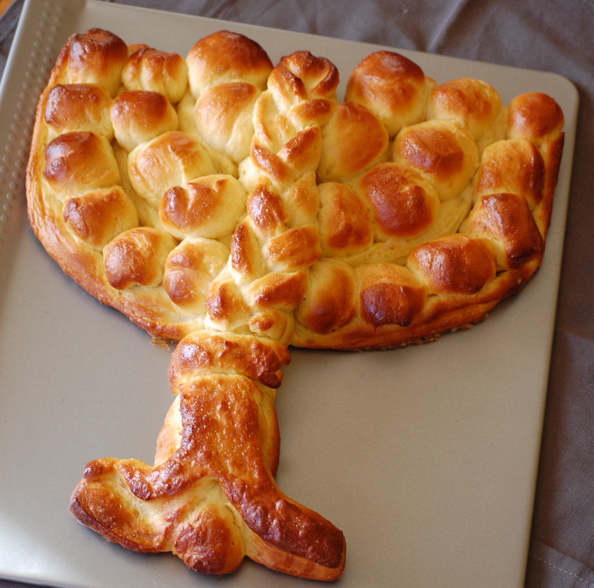 La mie est moelleuse, elle a du goût, elle est hyper fondante. Bref, une tuerie. Je l’ai préparé dimanche parce que j’avais envie de réaliser une énorme Menorah (kitschouille à mort) et je me suis vraiment bien amusée. Si vous voulez faire la menorah à chabbat (toujours sympa sur la table), prévoyez le double de pâte parce que je n’ai pu faire que deux hallot moyennes en plus.
