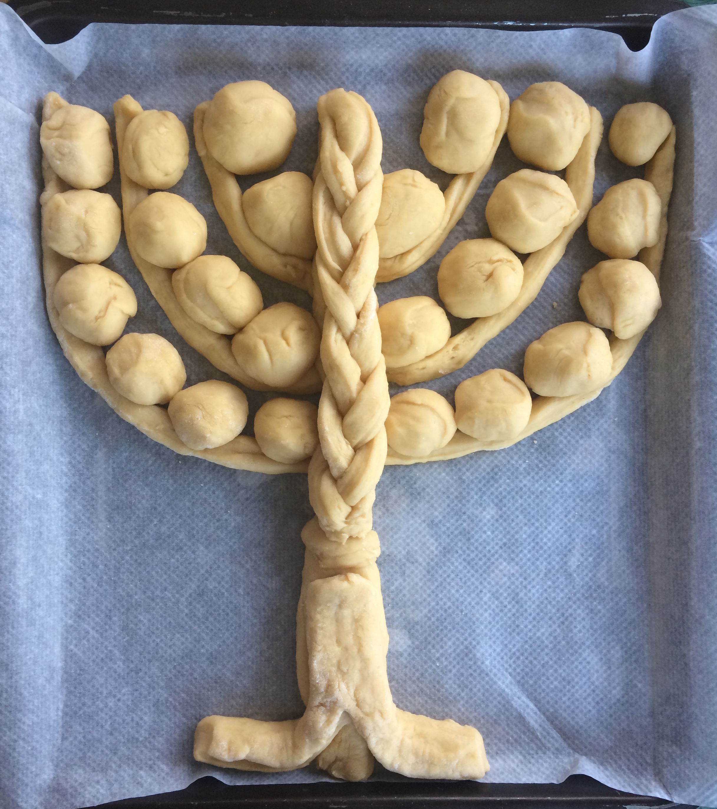 DSC_0227Une fois que la pâte a bien monté, dégazez la légèrement puis façonnez la. Pour la menorah, voici comment j’ai procédé : une partie centrale, quelque déco, et plusieurs petites boules pour les branches. La pâte a vraiment gonflé du coup pas assez d’espace entre les branches (mes plaques étaient trop petites). Je vous conseille presque de faire des tresses pour chaque branche ! Après, ce n’est pas trop compliqué, vous pouvez façonnez à votre façon !