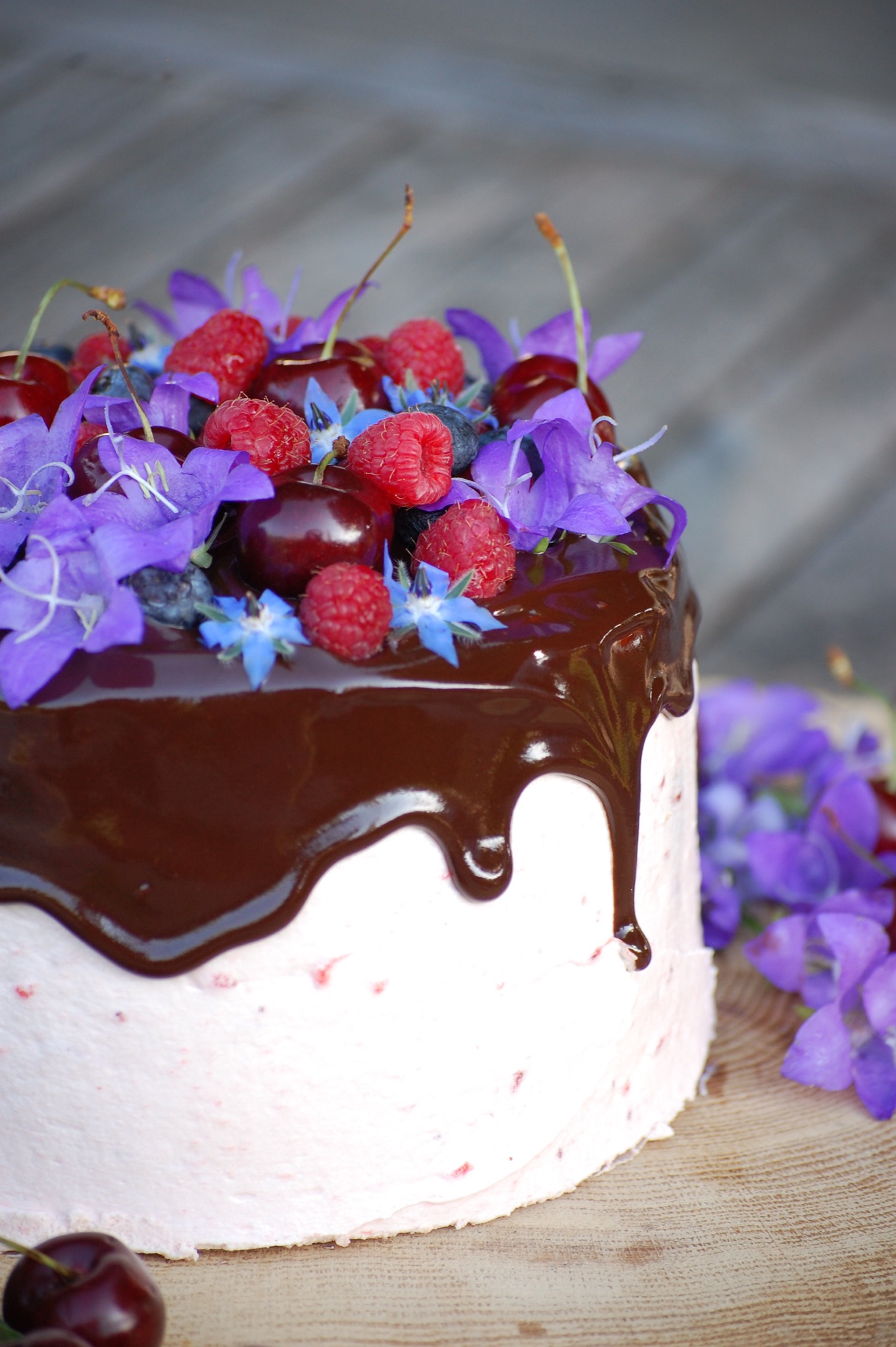 Pour la ganache, déposez la ganache au sommet du gateau, bien au milieu, et avec une spatule, faites couler légèrement au bord le glaçage pour obtenir cet effet de coulure. Décorez en suite de fruits à votre guise ! Et voilà !