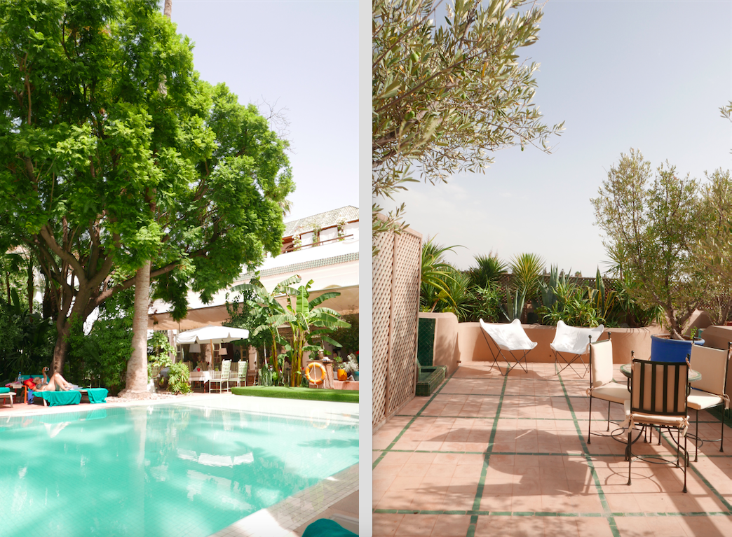 Capture d’écran 2015-10-22 à 16.45.38On passe maintenant à nos moments détentes : j’avais recherché avant de partir différents endroits où profiter de la piscine dans un cadre calme. On a trouvé notre bonheur aux Jardins de La Medina : en plein milieu de la Kasbah (un chauffeur peu scrupuleux nous a déposé hyper loin, on a eu un peu peur !). Après plusieurs quinzaines de minutes à chercher le lieu : magie ! Un petit coin de paradis, d’un calme olympien. Christiane, la directrice ultra charmante et ultra attentionnée, nous a fait une petite visite de l’hôtel : plusieurs styles de chambre, et surtout, surtout, pleins de petites terrasses privées pour que chaque occupant de l’hôtel ait son petit coin tranquille. Une salle de sport, un spa, des cours de cuisine marocaine et un barbier sur le rooftop (j’en connais un qui a faillit se laisser tenter !). Le plus : l’immense végétation sur 3000m2. Christiane nous a dit qu’il s’agissait d’un des plus grands jardins de la Medina : plusieurs tortues s’y promènent et apparemment on peut y voir également un iguane.