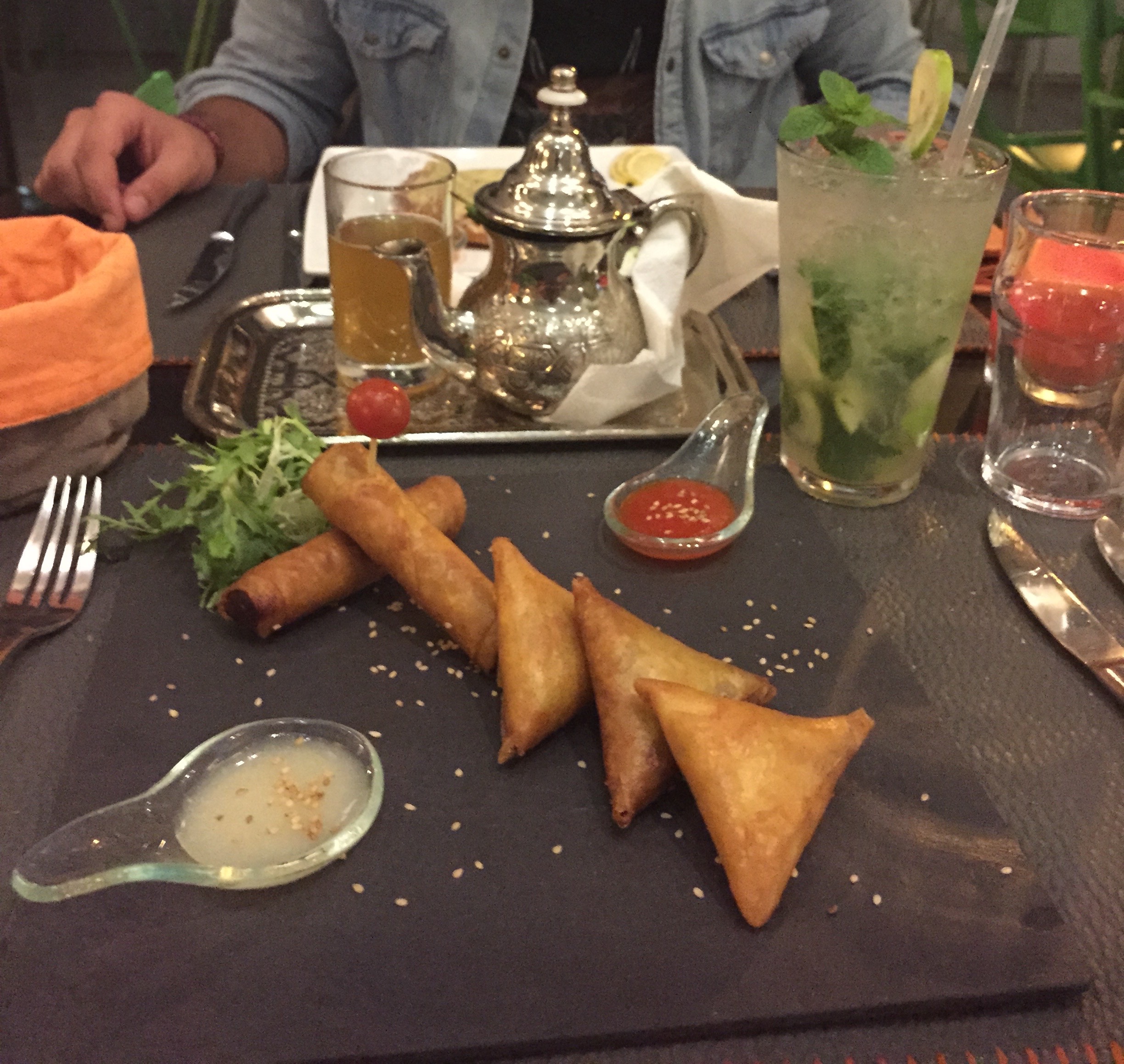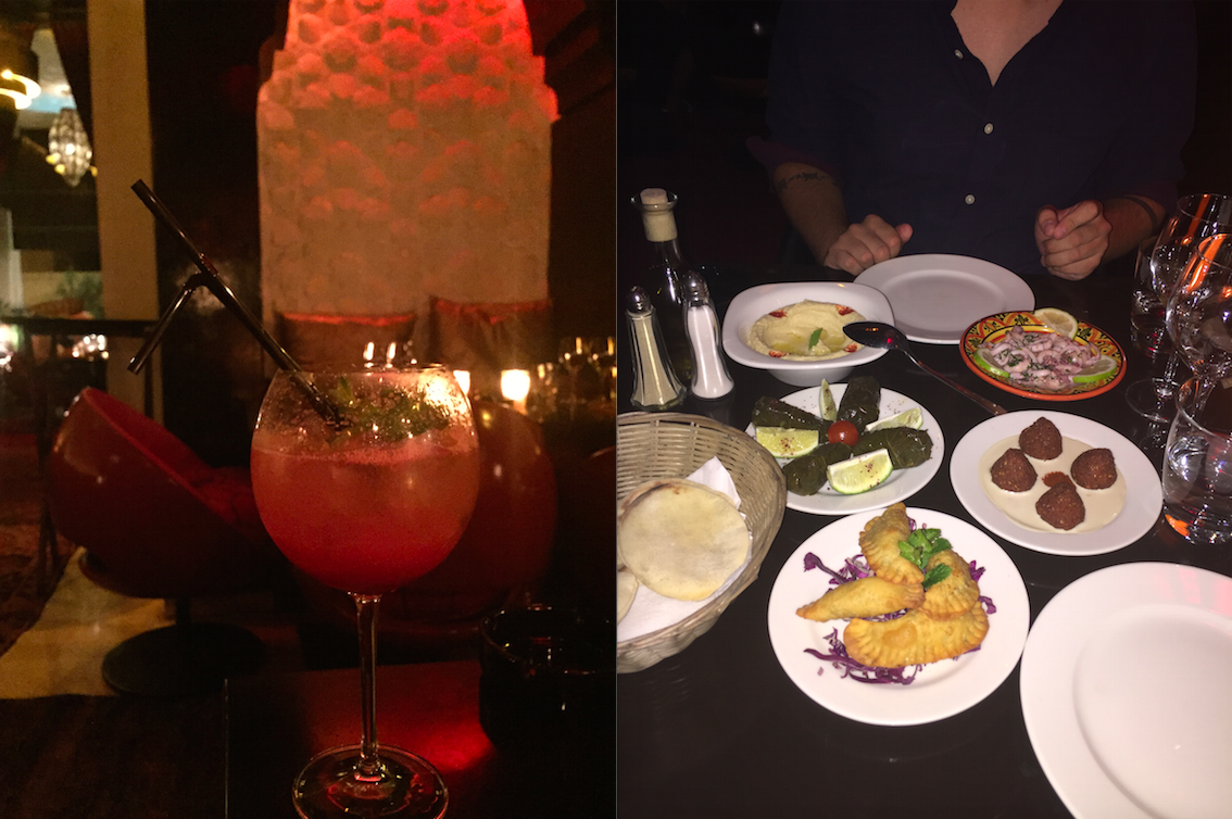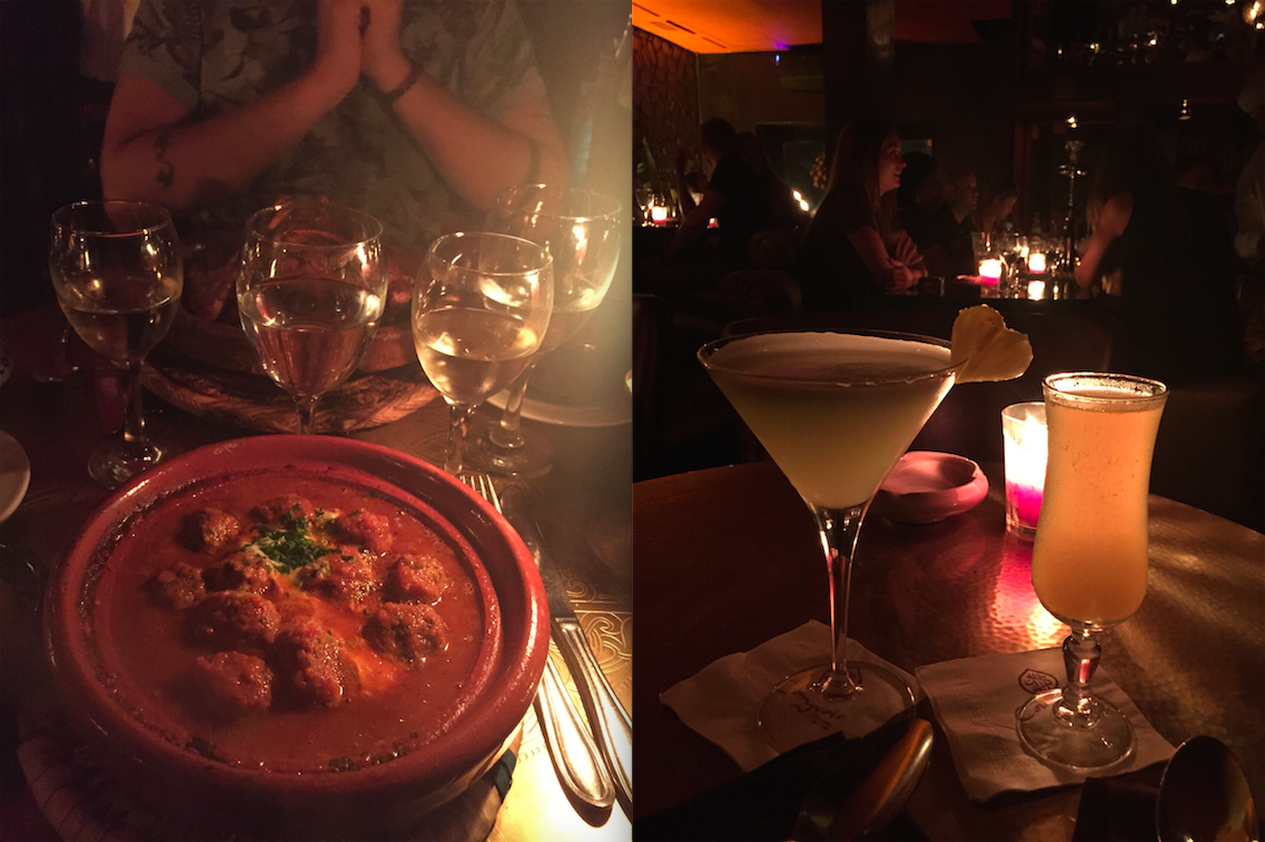 Azar est le petit frère du comptoir darna. Situé dans le Gueliz, la nouvelle ville, la façade majestueuse vous bluffe des votre arrivée. Emmanuel, le directeur du restaurant, nous à accueillit avec un grand sourire et nous a présenté le programme de la soirée. Show de danseuses et groupe berbère. On vous apporte la carte des cocktails : elle est immense. Tellement immense que j’avais des doutes sur la qualité. Et puis je choisis une piscine rose (champagne, fraises, lytchee). Et puis je sens les grains de fraises fraîches. Et puis je suis conquise. Mon compagnon a pris le cocktail Hemingway, plus corsé mais toujours aussi subtile. Nous avons décidé de prendre plusieurs mezzes : comptez 45 Dh/mezze (soit 4,50€!!!). Énorme crush : la carte est vraiment riche. Mention spéciale aux falafels qui ont bien faillit détrôner ceux de Paris dans mon cœur. Et les mouhalabieh fromage.