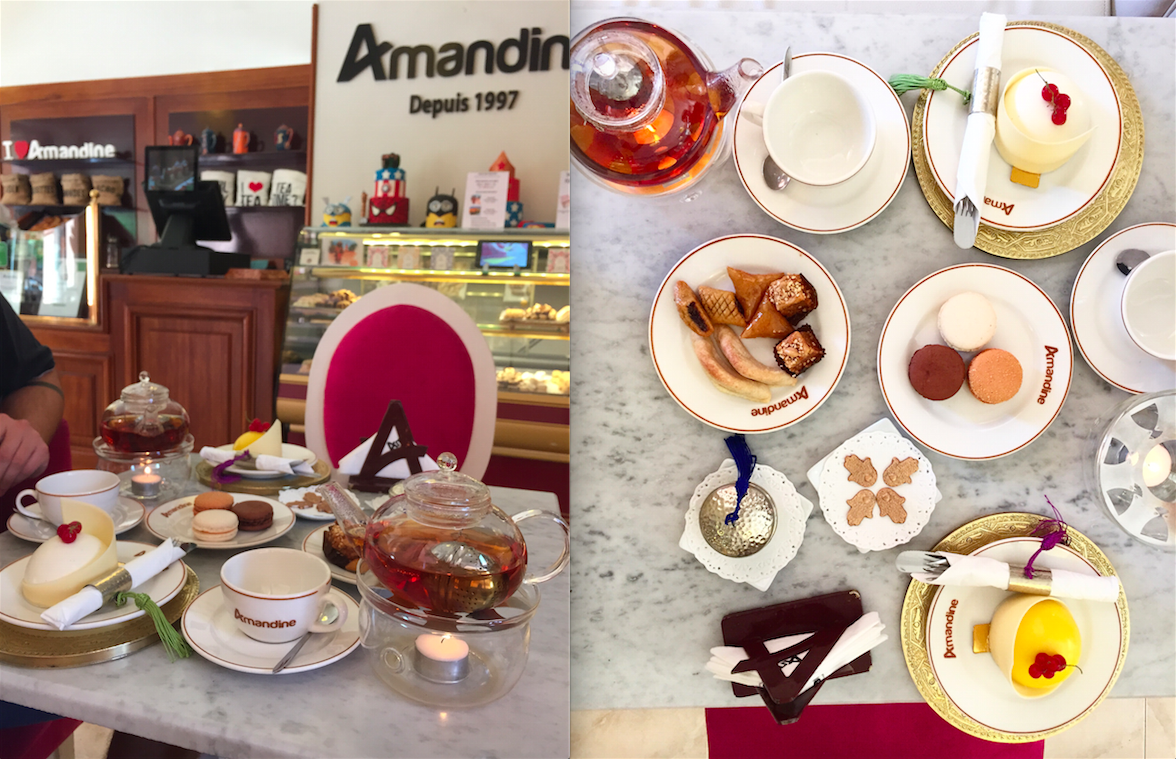 Pas un restaurant mais un salon de thé, et quand on sait ce que Marrakech nous offre comme délices et saveurs, il est impossible de ne pas prendre le temps d’aller boire un thé en dégustant des pâtisseries orientales. Située dans la nouvelle ville, Amandine vous offre un très large choix de pâtisseries orientales et occidentales. Je vous entends déjà sortir les fourches en disant que c’est bête d’aller au Maroc et de déguster de la pâtisserie française : certes, mais elles sont ultra bien faites, et pour les Marocains il s’agit d’une adresse clé ! Les pâtisseries orientales étaient délicieuses, les macarons également. Et la sélection des thés…. Fleur d’oranger et rose pour ma part : un délice, dans des petites théières transparentes avec un petit chauffe plat. Un endroit tout en délicatesse.