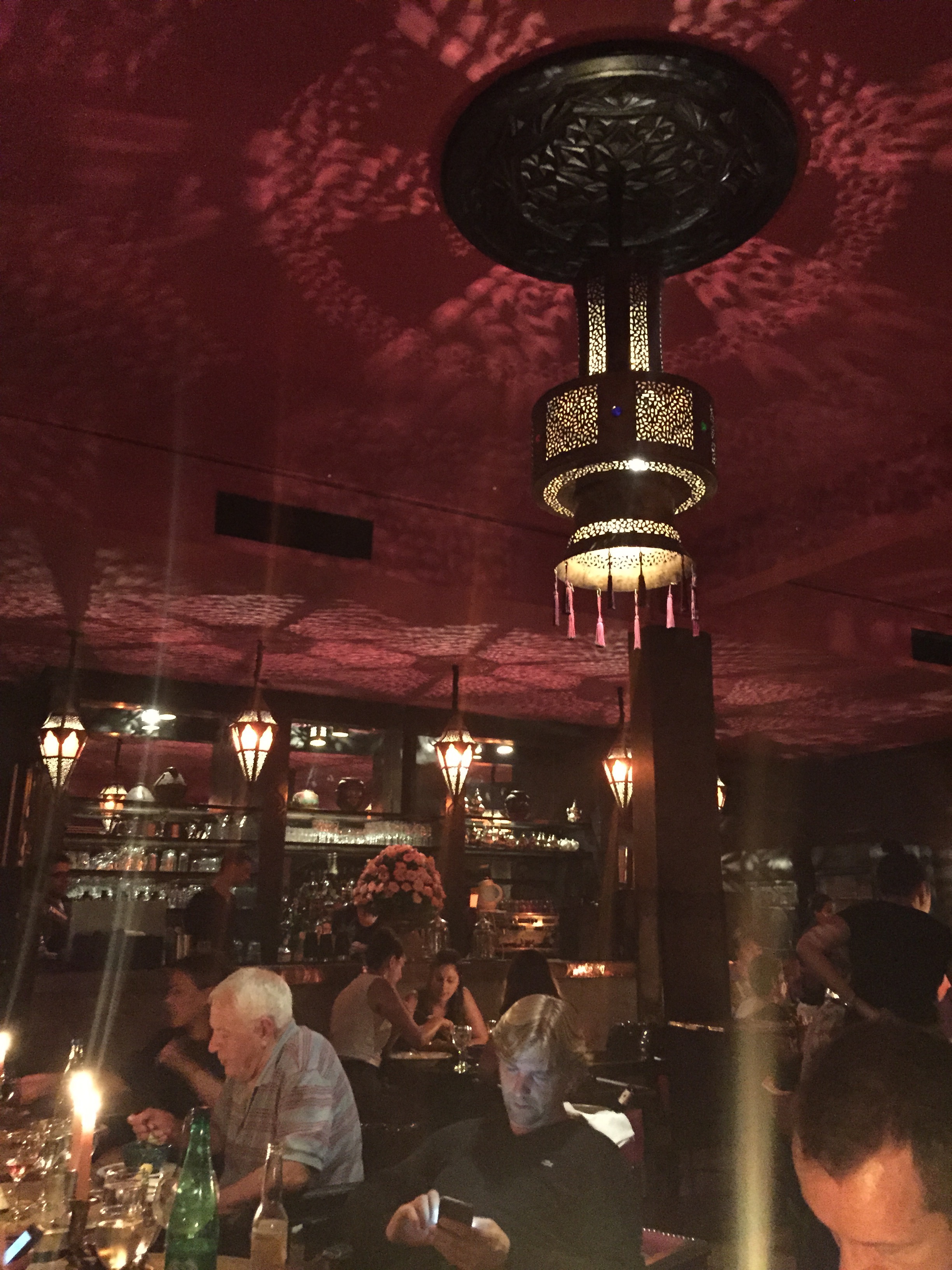 Ne me demandez pas de décrire le Comptoir Darna en un seul mot car j’en serais incapable. Cest a la fois un restaurant, une salle de spectacle, un bar lounge et un club. Et oui. Le cadre est somptueux. La nourriture exceptionnelle. Le cocktail du jour était un mojito a la pastèque. Nous avons testé l’entrée « 7 salades » (ce ne sont que des kemias de légumes donc pas de problème du côté du manque d’appétit en suite !). La pastilla poulet amandes est délicieuse.