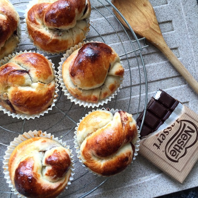 Laissez lever 1h. Formez vos brioches. Pour la garniture au chocolat : j’ai fait fondre une tablette de chocolat auquel j’ai rajouté un peu de lait d’amandes pour diluer et de l’huile. J’ai fourré mes petites brioches avec cette pâte.