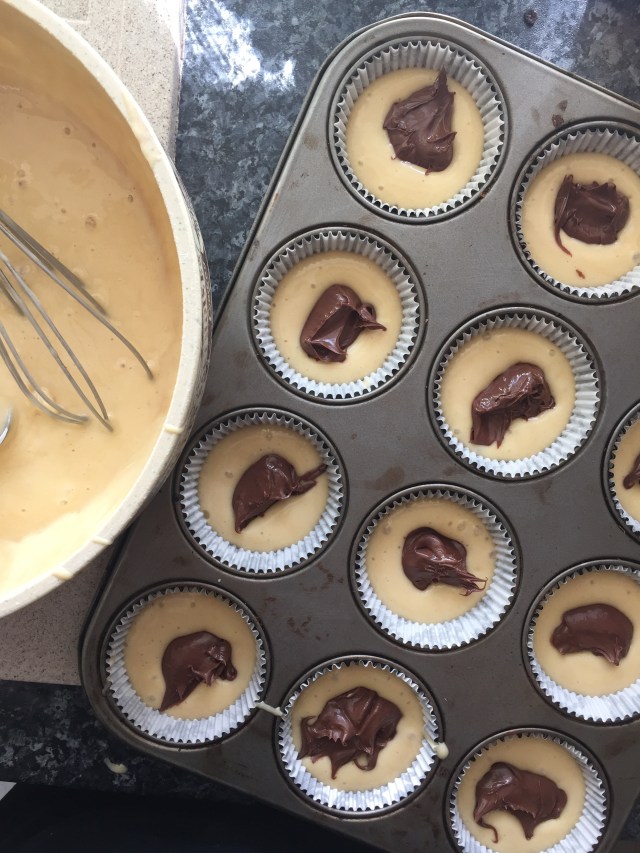Mélangez tous les ingrédients secs ensemble. Creusez un puis et ajoutez en suite les ingrédients liquides. Mélangez tout. Remplissez vos caissettes juste au fond, puis ajouter une cuillère à café de Nutella au milieu, et déposez en suite une autre bonne cuillère à soupe de pate.