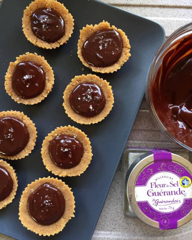 Enfin, versez délicatement une couche fine de chocolat noir fondu sur le dessus de vos tartelettes. Saupoudrez le chocolat de quelques grains de fleur de sel. Laissez refroidir jusqu’à la dégustation.