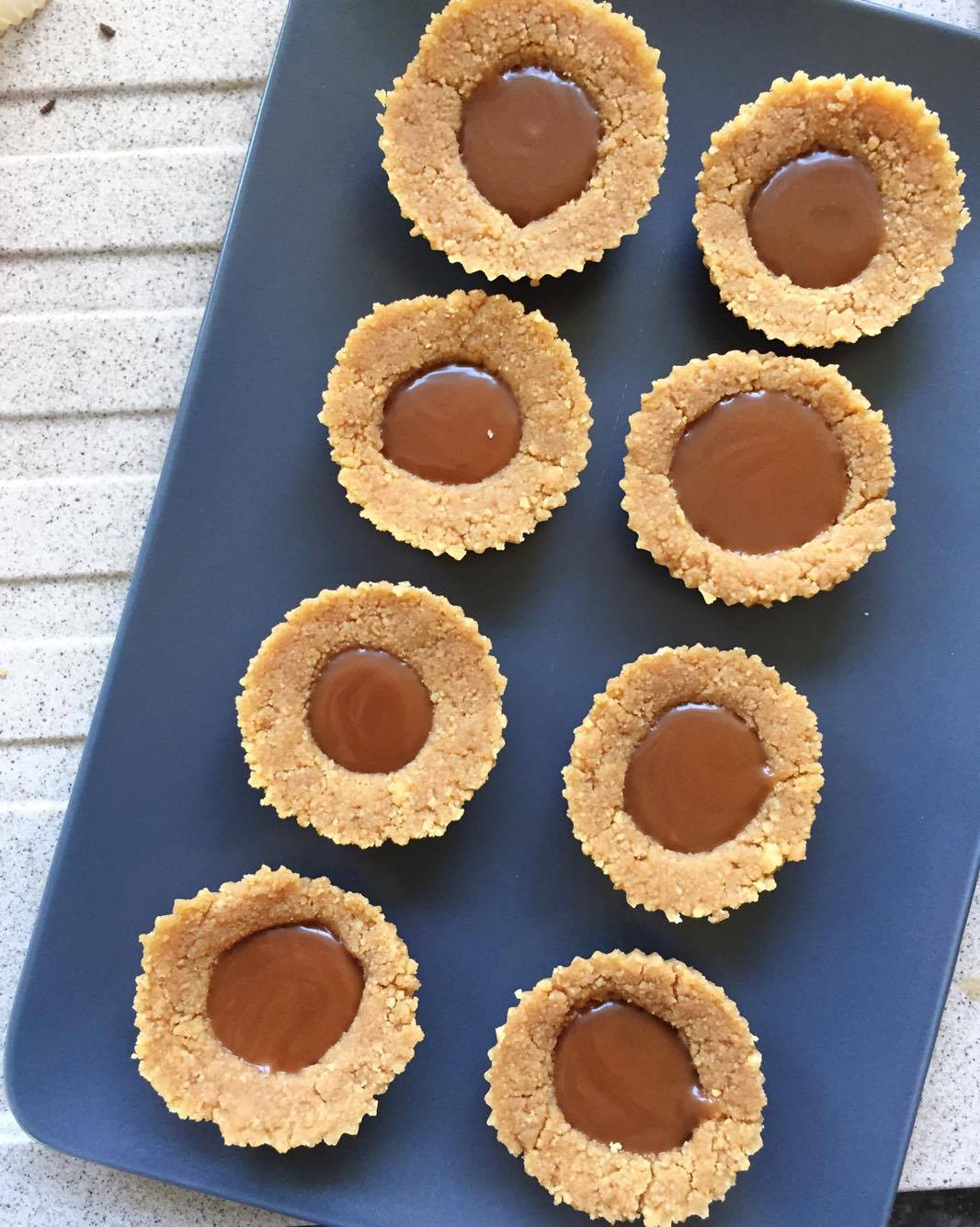 Démoulez les tartelettes délicatement et versez du caramel dans le trou préalablement formé. N’allez pas jusqu’à la surface mais laissez quelques millimètres afin d’accueillir en suite la couche de chocolat. Laissez refroidir 30min au réfrigérateur.