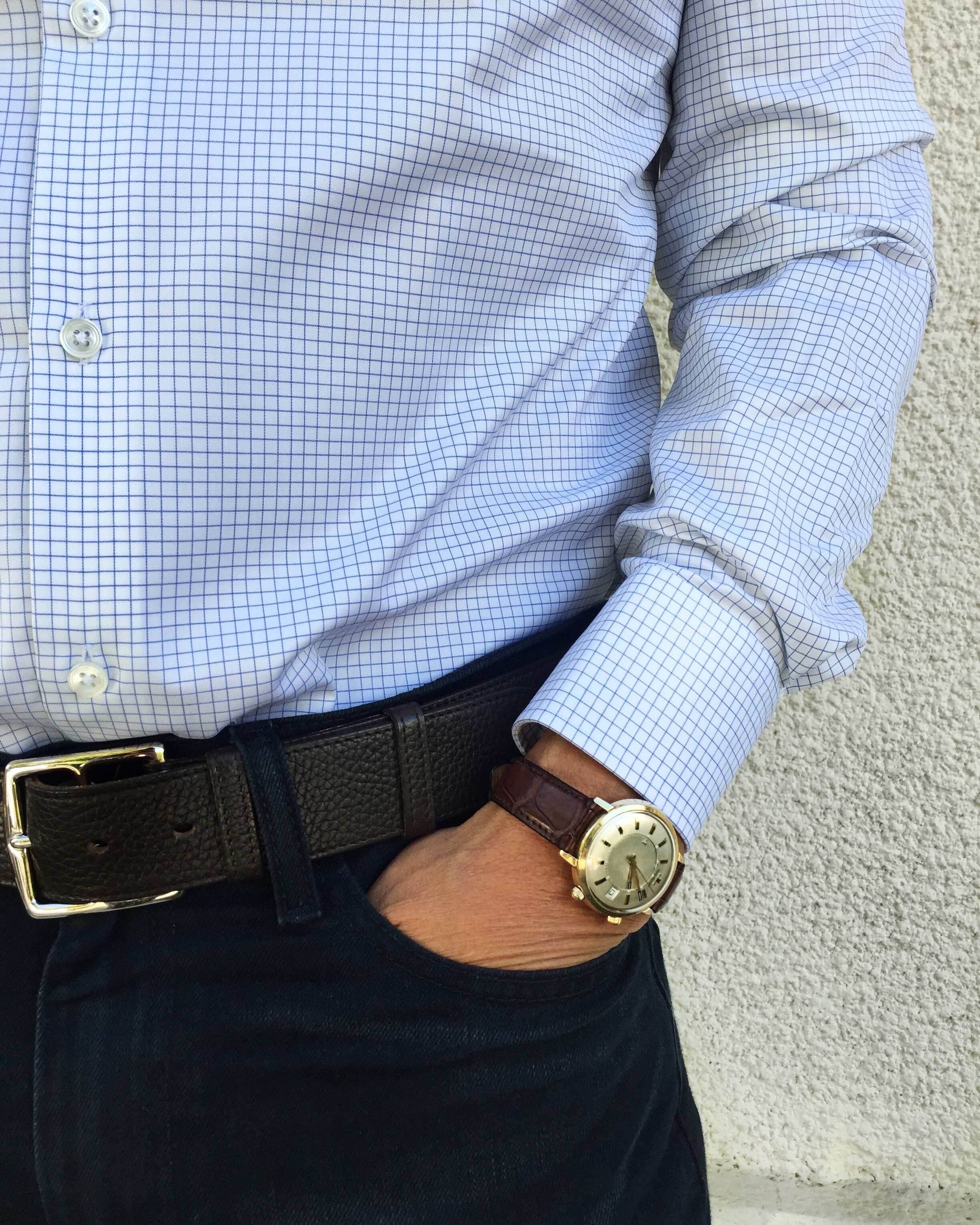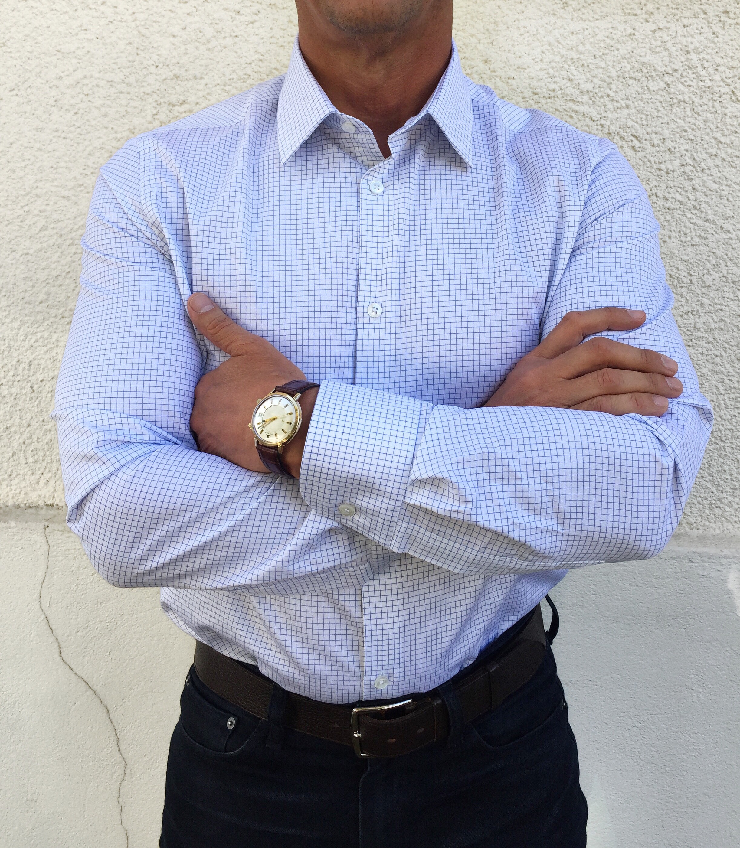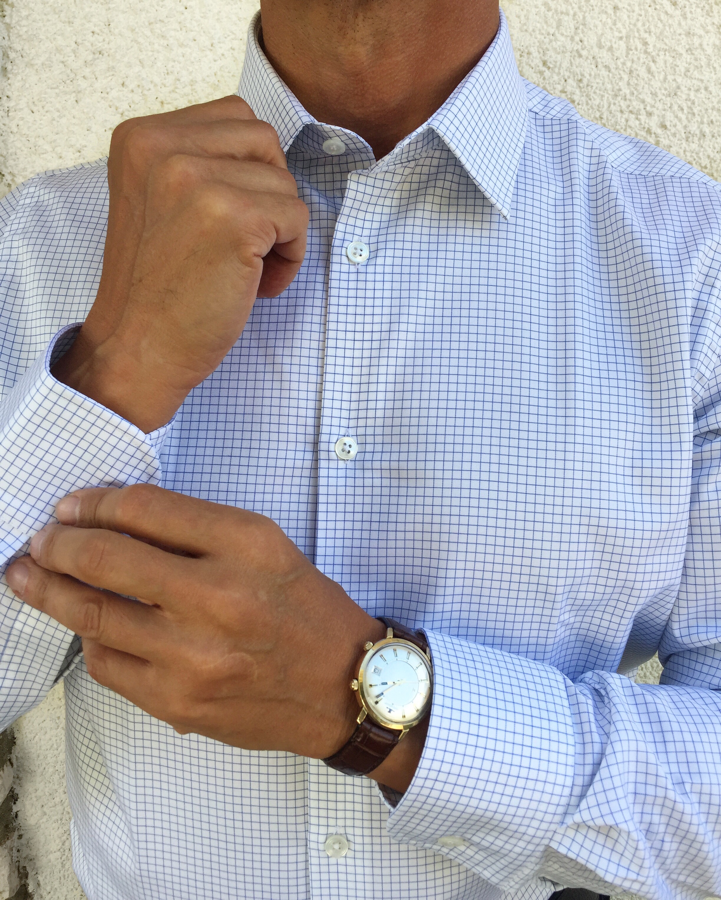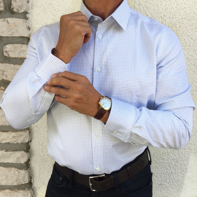 J’ai pris le modèle mini-carreaux bleu, un classique. Il est très facile de trouver sa taille. Les chemises sont 100% coton, et vous pouvez choisir votre coupe : j’ai choisi ici une modern fit (cintrée).
