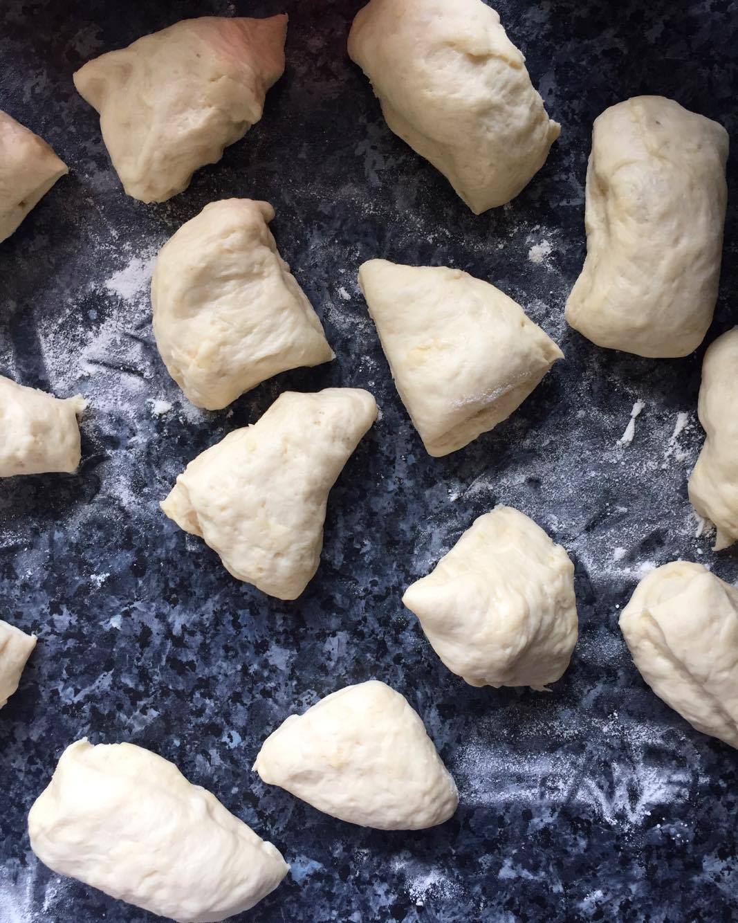Une fois le temps écoulé, découpez la pâte en deux et placez chaque boule dans un gros sac congélation pendant 10 min : cela va accélérer la pousse. Détaillez en suite dans chaque boule 8 morceaux de tailles égales : vous obtiendrez donc 16 portions.