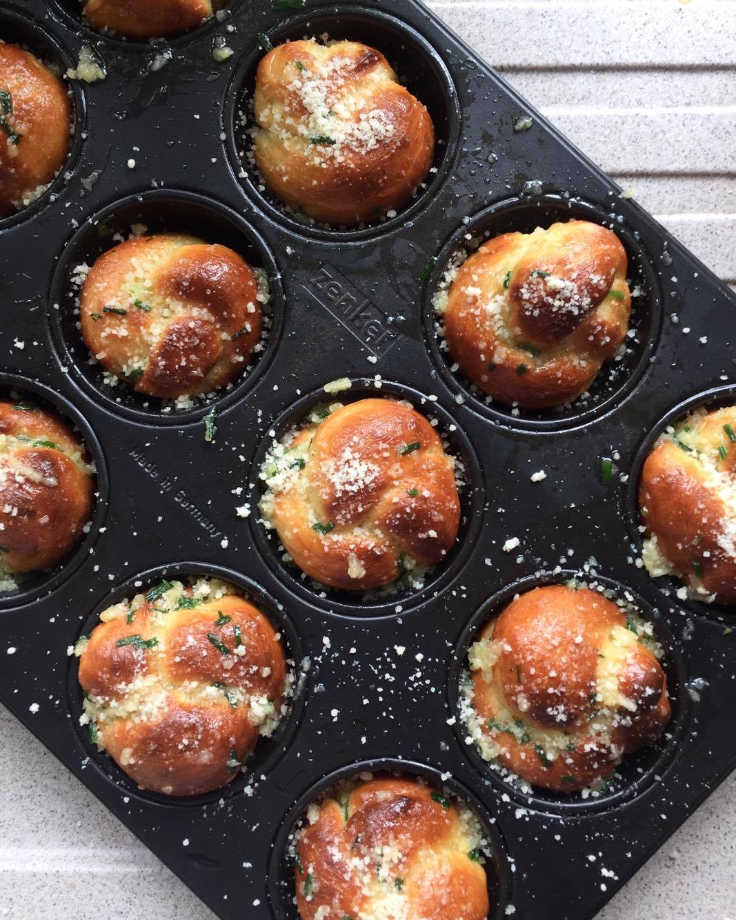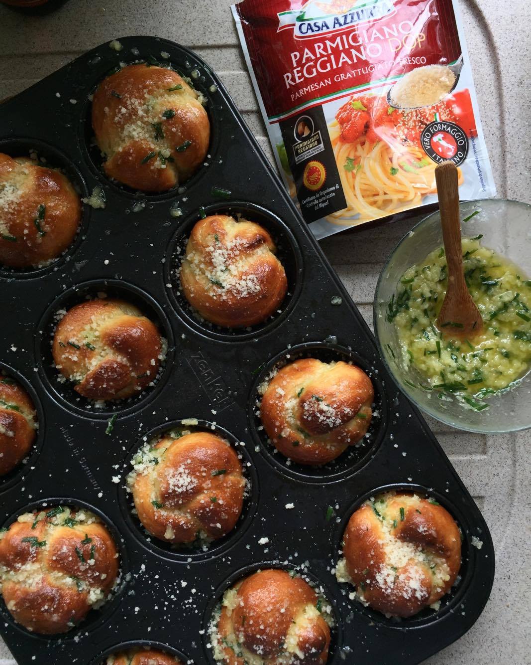 Une fois que les noeuds sont sortis du four, encore chaud, badigeonnez les avec un pinceau du beurre fondu. Pour les extra gourmands, vous pouvez saupoudrez d’encore un peu plus de parmesan à la fin… un délice !