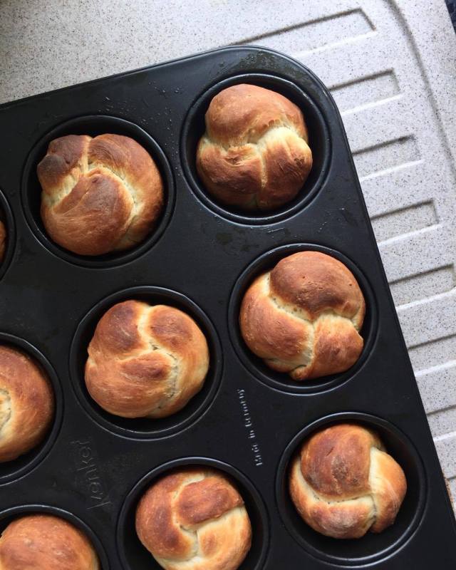 Pour le façonnage, prenez une petite boule et étalez la en boudin. En suite, faites un noeud avec le boudin. Placez les noeuds dans des moules à muffins préalablement huilés (vous pouvez également les faire pousser sur une plaque de cuisson recouverte de papier sulfurisé). Laissez reposer encore 30 min.