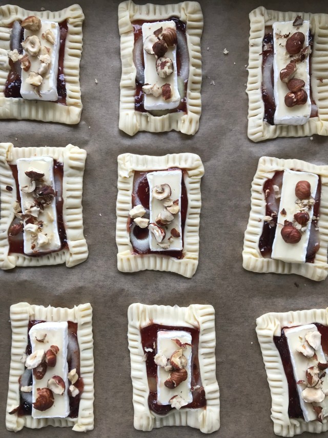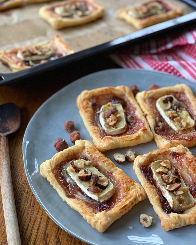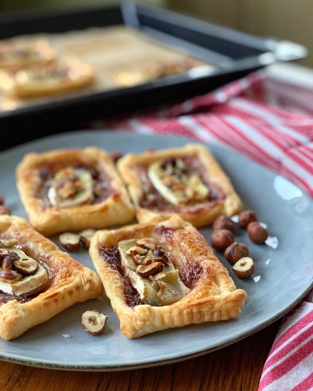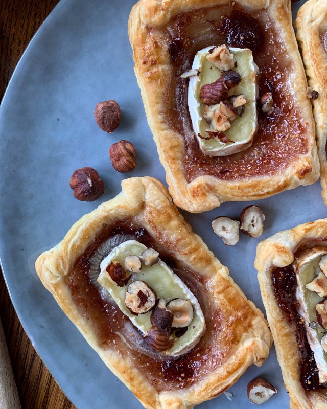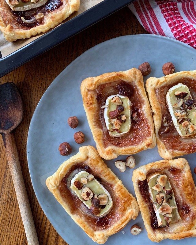 Découpez 9 rectangles égaux dans votre pâte feuilletée. Etalez environ 1 cuillère à café de confit de figues. Disposez en suite quelques rondelles d’oignons cru (elles vont caraméliser à la cuisson avec le confit de figues). Ajoutez en suite une bonne tranche de brie : mais veillez à laissez un peu de pâte autour pour refermer la tartelette. Parsemez de noisettes concassées.