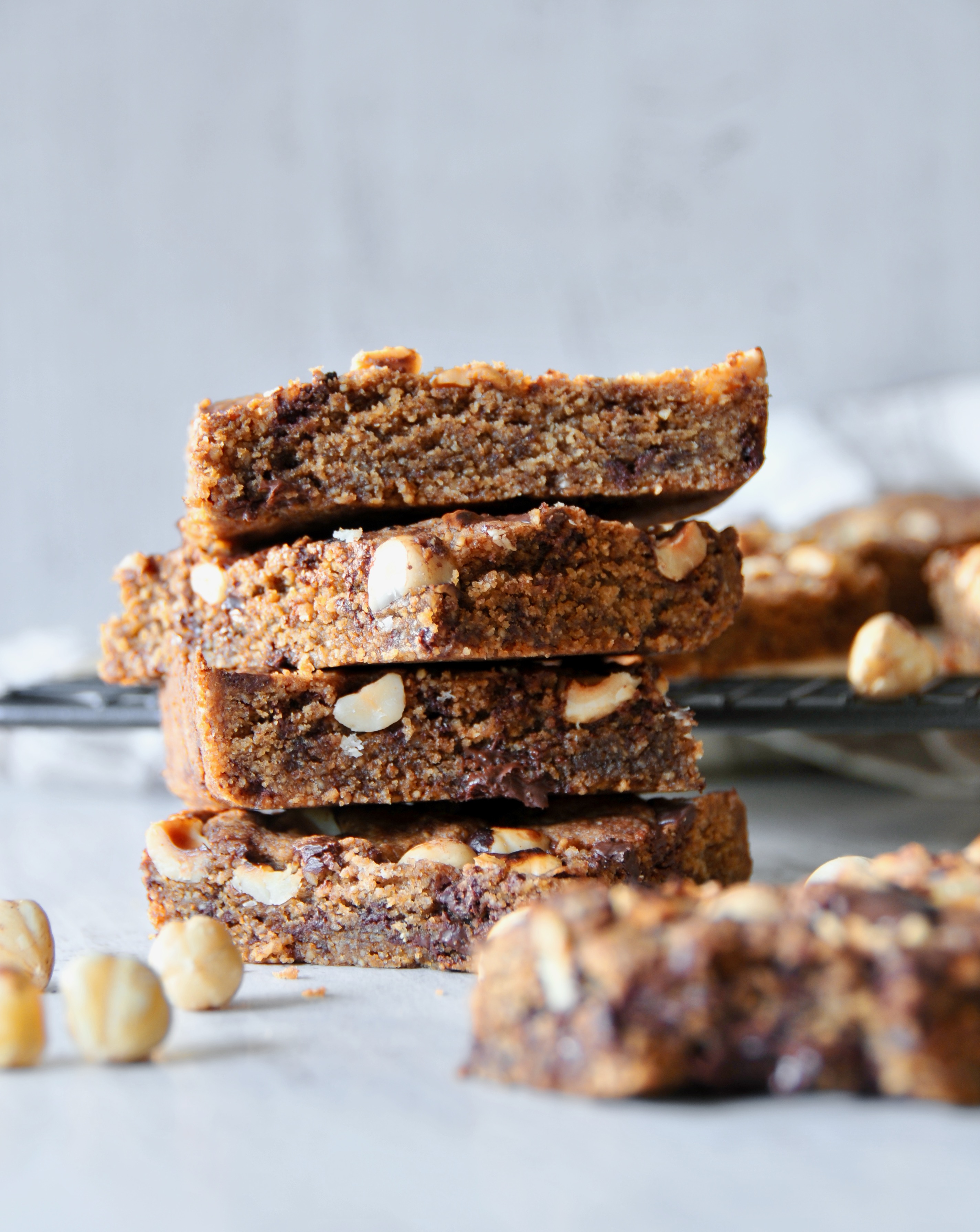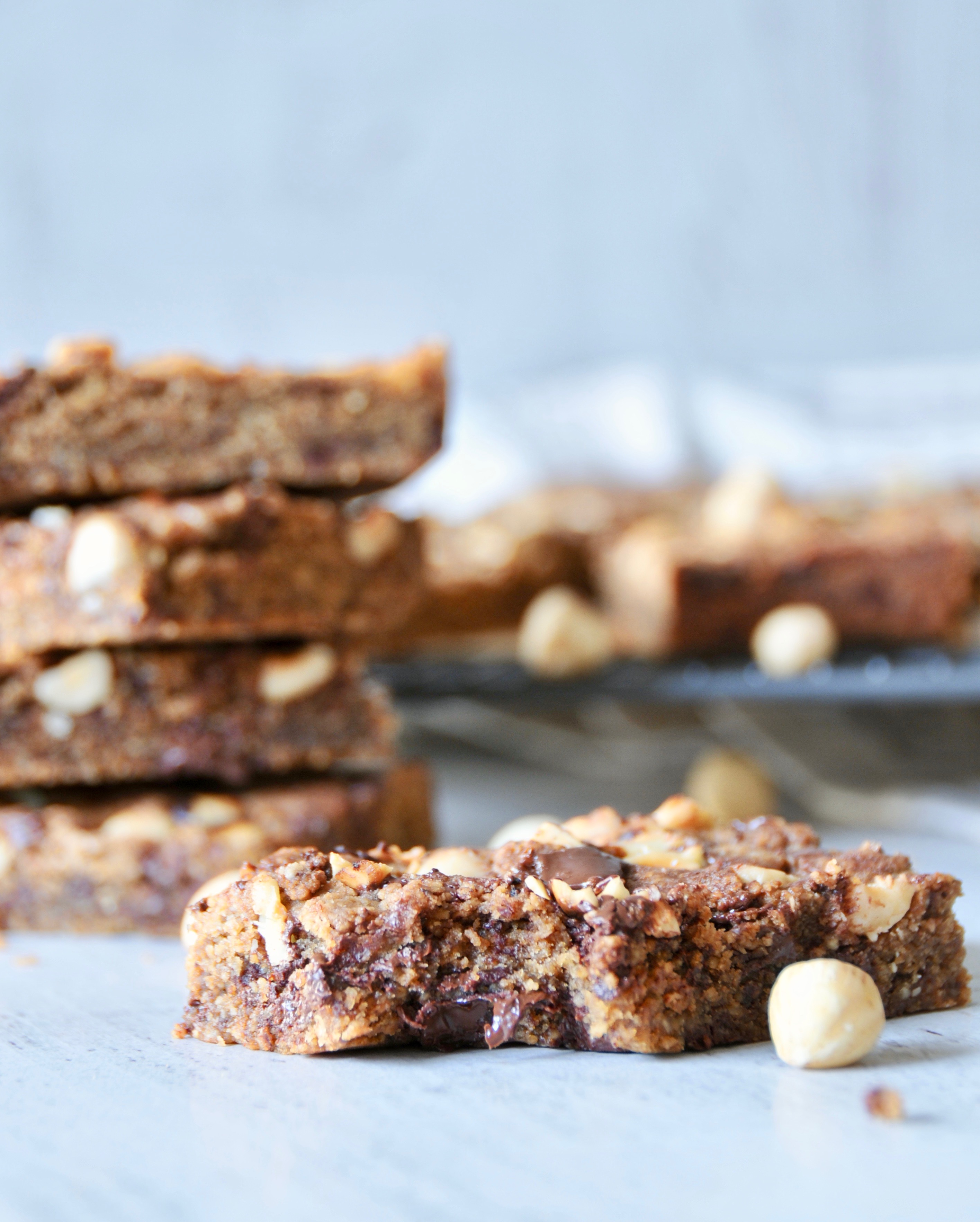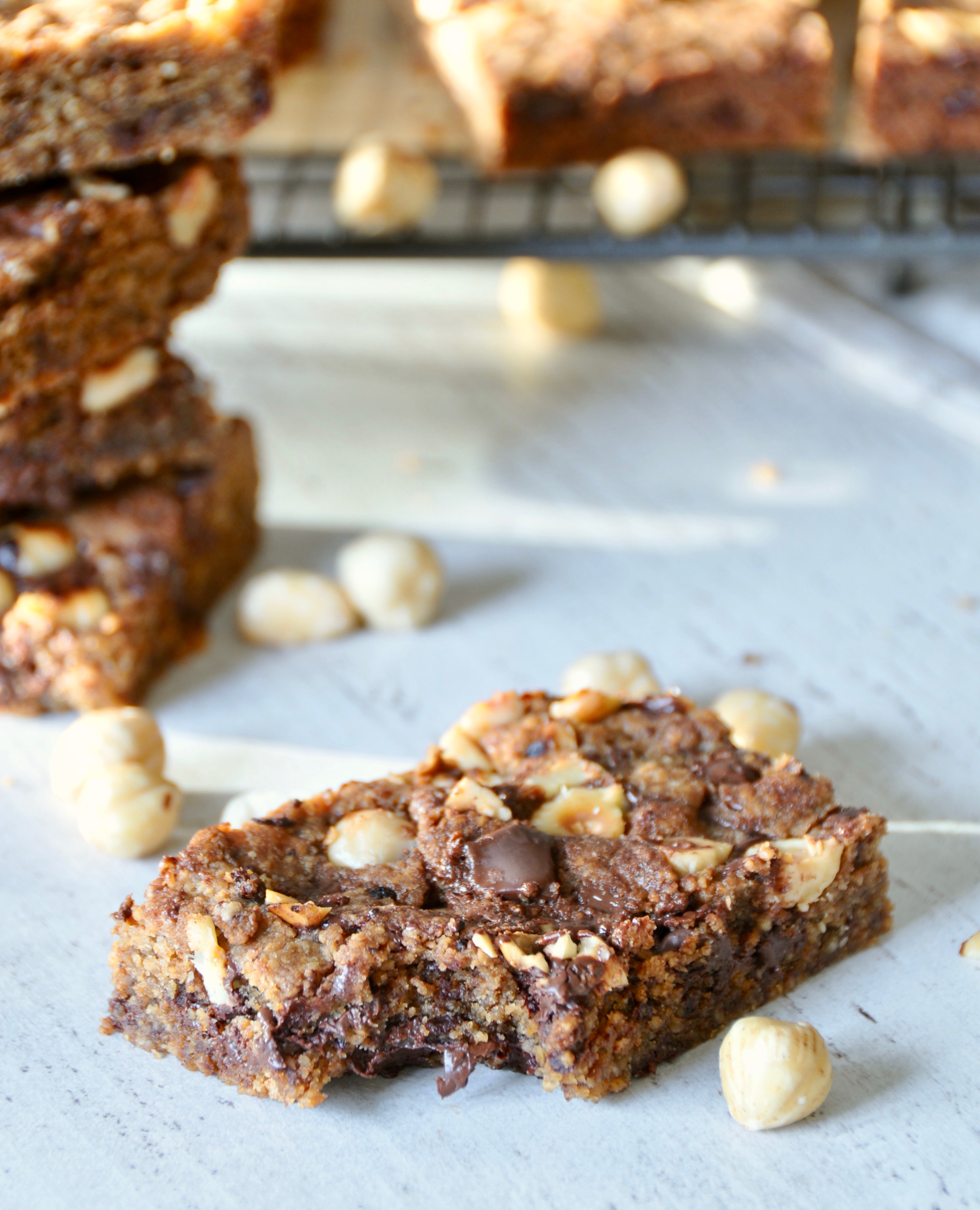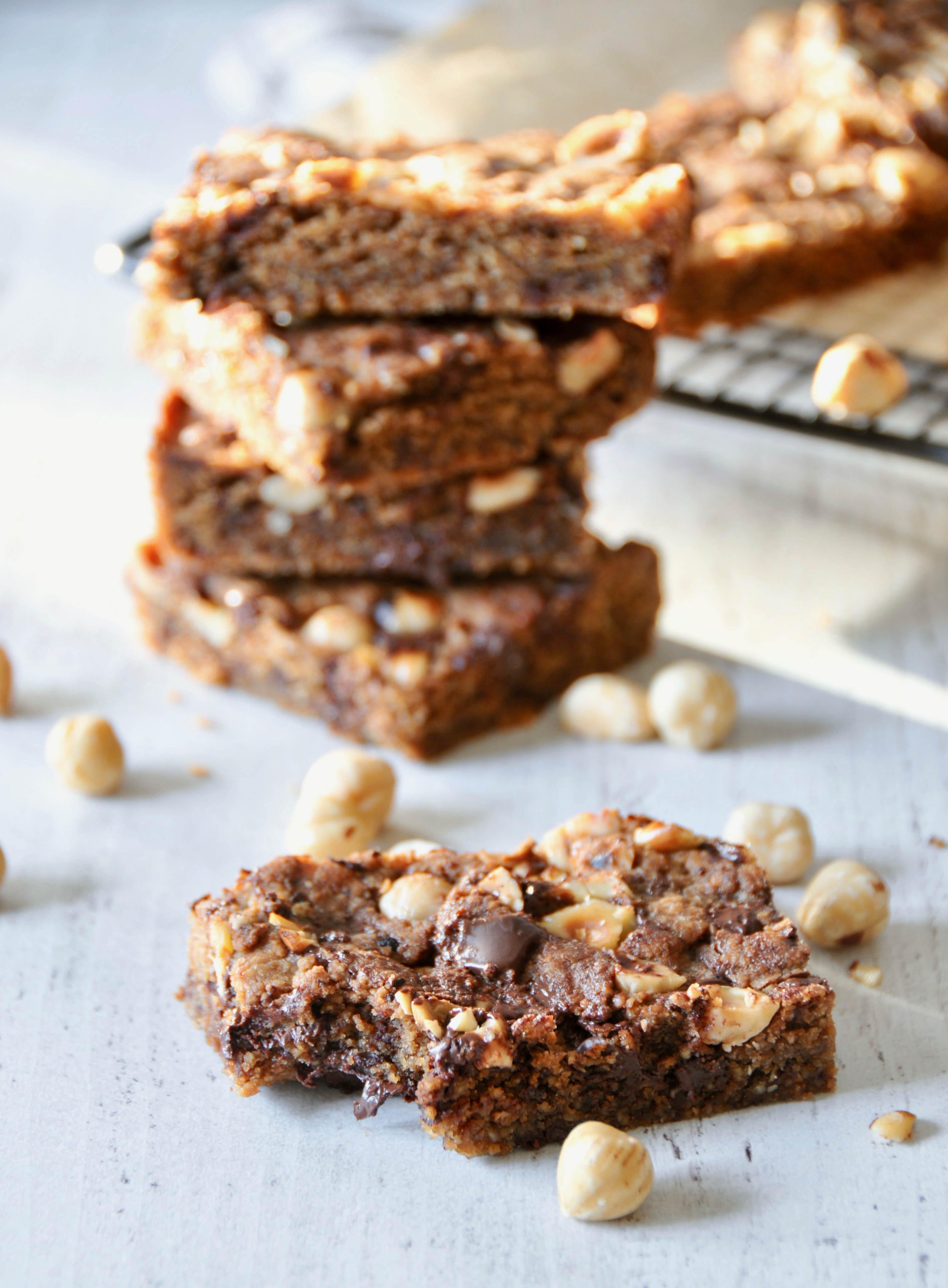 Et quel délice ! Un blondie moelleux, croustillant autour, avec un bon goût de noisettes torréfiées et de chocolat qui donnent l’impression de croquer dans un cookies moelleux au nutella…. Ça vous fait rêver, nan ? Et le must : c’est vegan, donc bon pour vous, donc ça compte presque pas comme un gâteau, nan ?